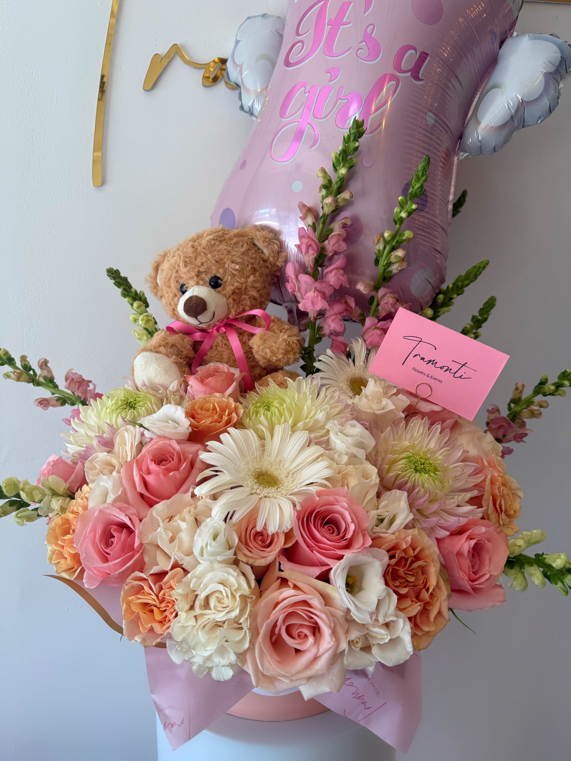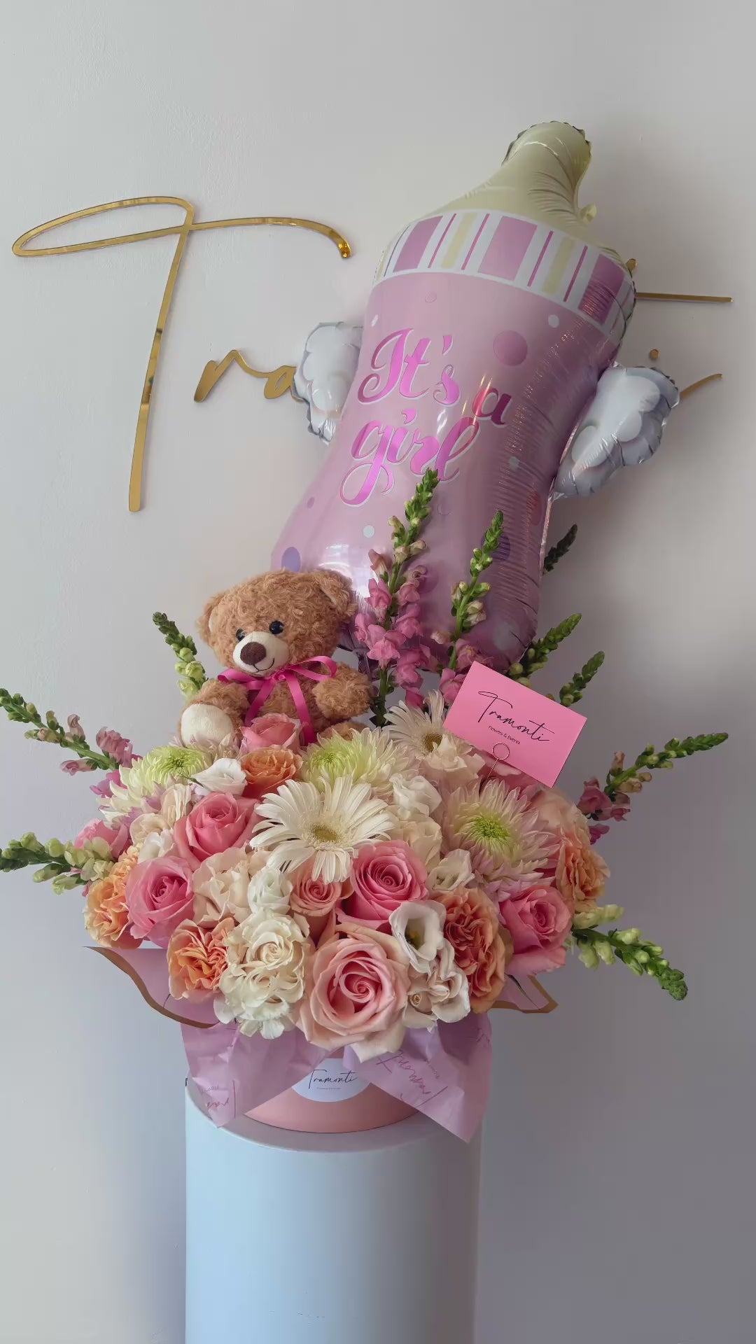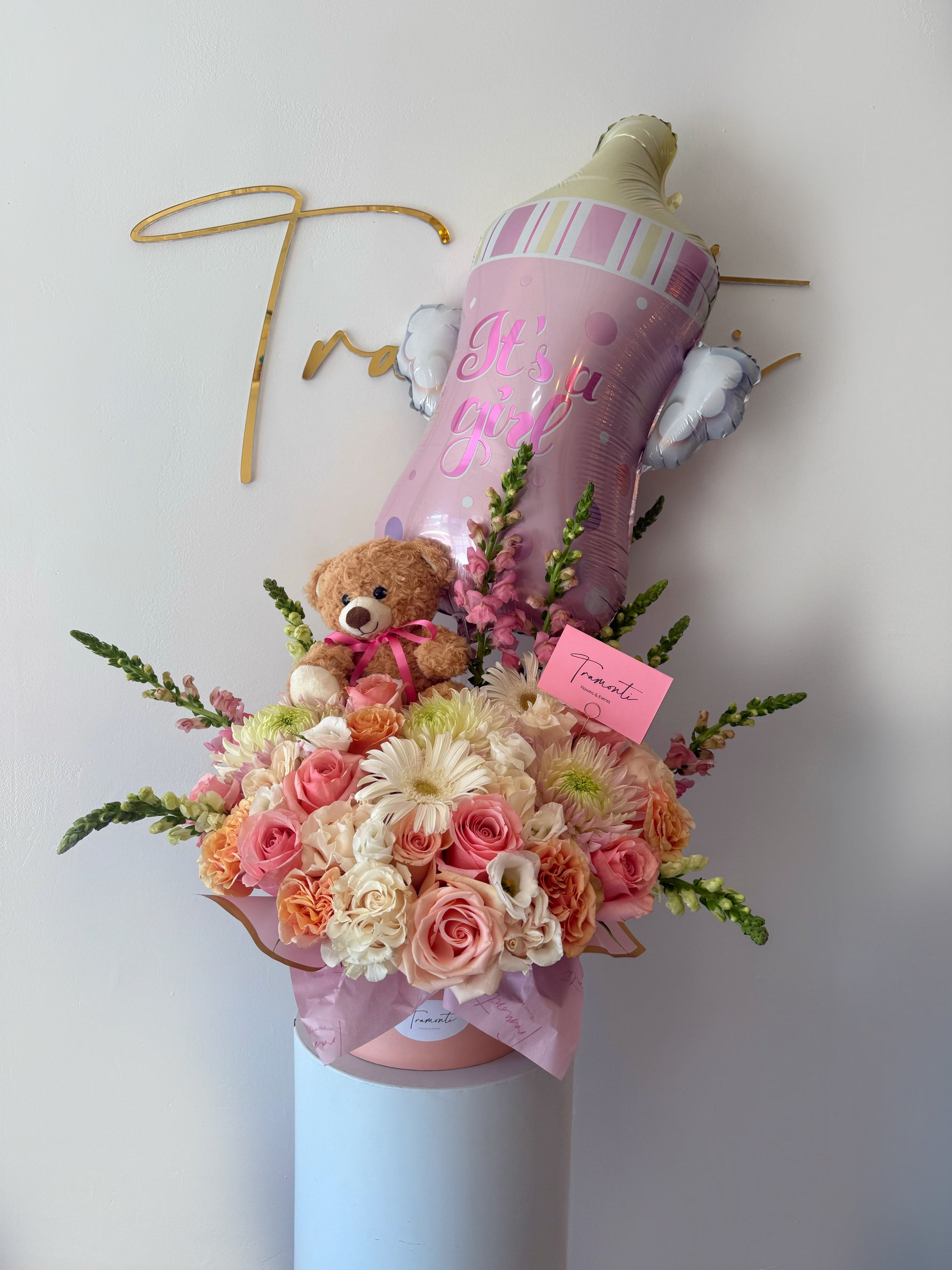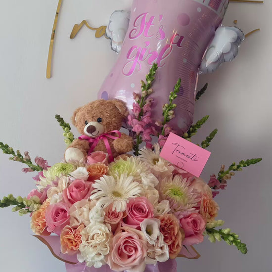 Welcome a beautiful baby girl with this pastel pink flower arrangement, thoughtfully designed in a delicate pink box. It features a lovely mix of soft pink roses, white gerberas, pink lisianthus, mini carnations, chrysanthemums, and snapdragons for a touch of height and texture.