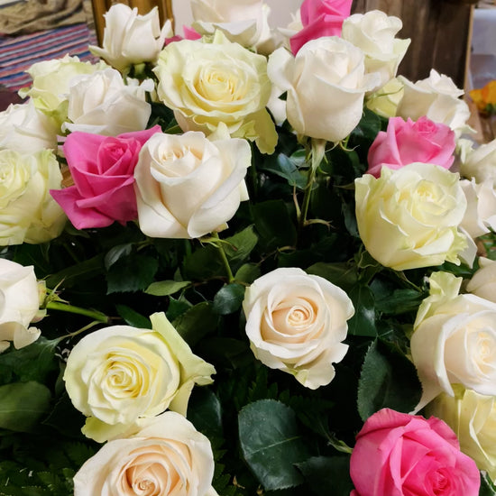 "Explore our 'Rose Paradise Garden Floral Basket Arrangement' featuring a harmonious blend of premium white roses and a delicate infusion of pink roses. Meticulously curated, it adds a touch of timeless elegance to any space. Nestled within a tasteful basket, this floral creation is more than just an arrangement; it's a captivating garden-inspired composition, evoking serenity and romance. Ideal for those who cherish nature's beauty in a meticulously crafted display."