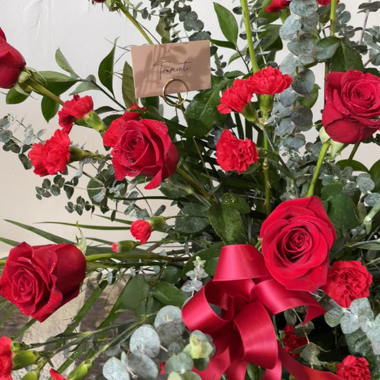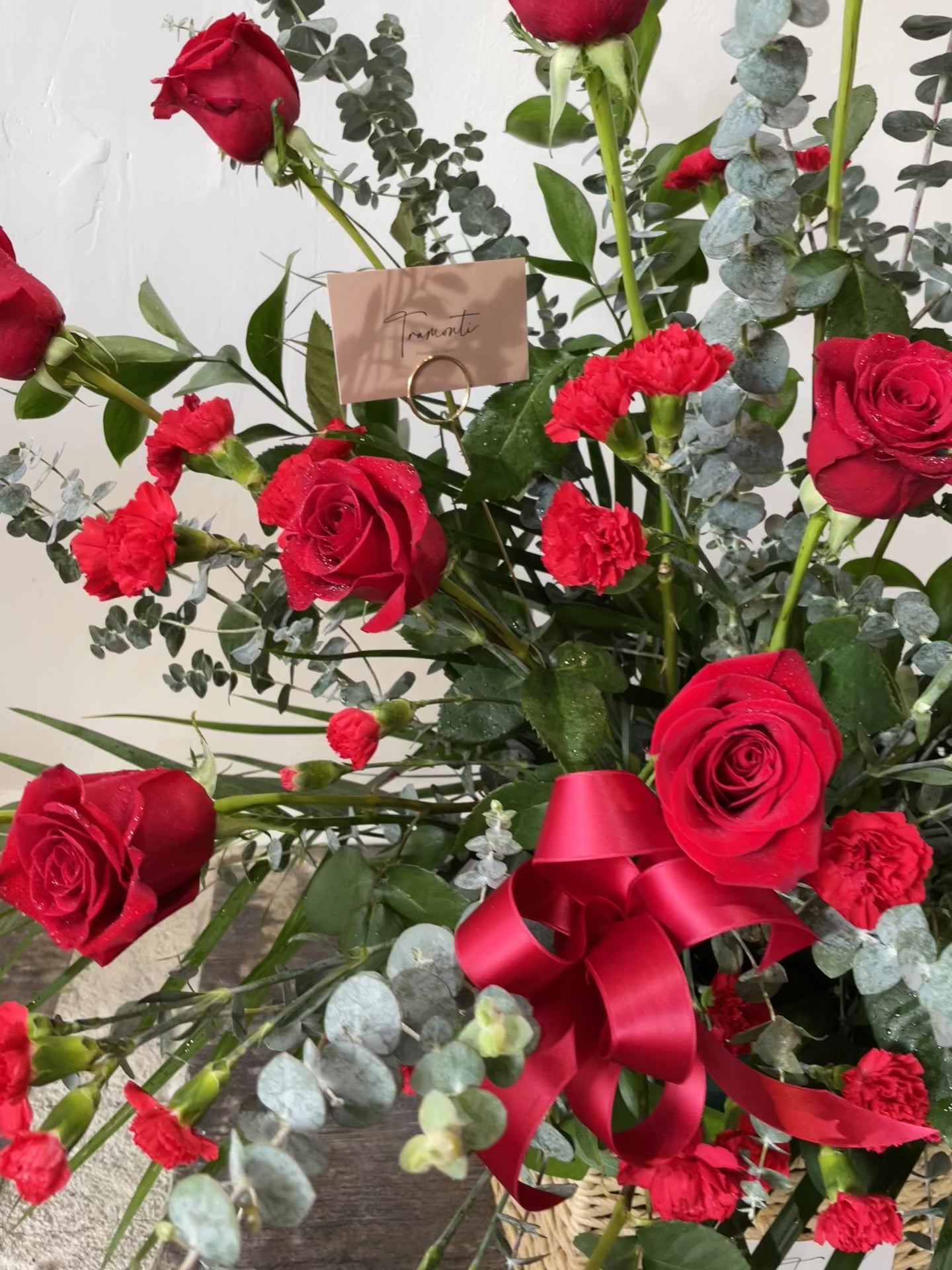 Immerse yourself in the vibrant allure of this basket arrangement. A love explosion of red roses, carnations, mini carnations, and eucalyptus creates a visual symphony of passion and romance. The diverse blooms harmonize, expressing a rich tapestry of emotions. Eucalyptus leaves add a touch of freshness and elegance, making this arrangement not just a display but a sensory journey, capturing the essence of love in a delightful explosion of petals."