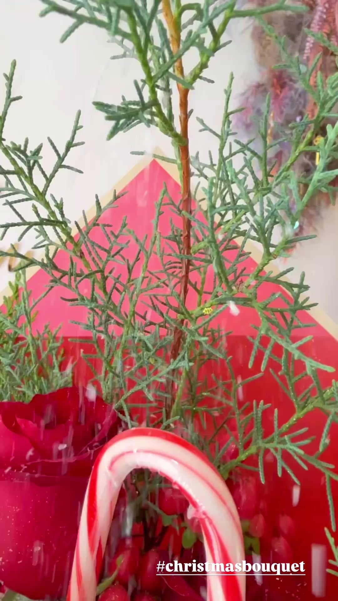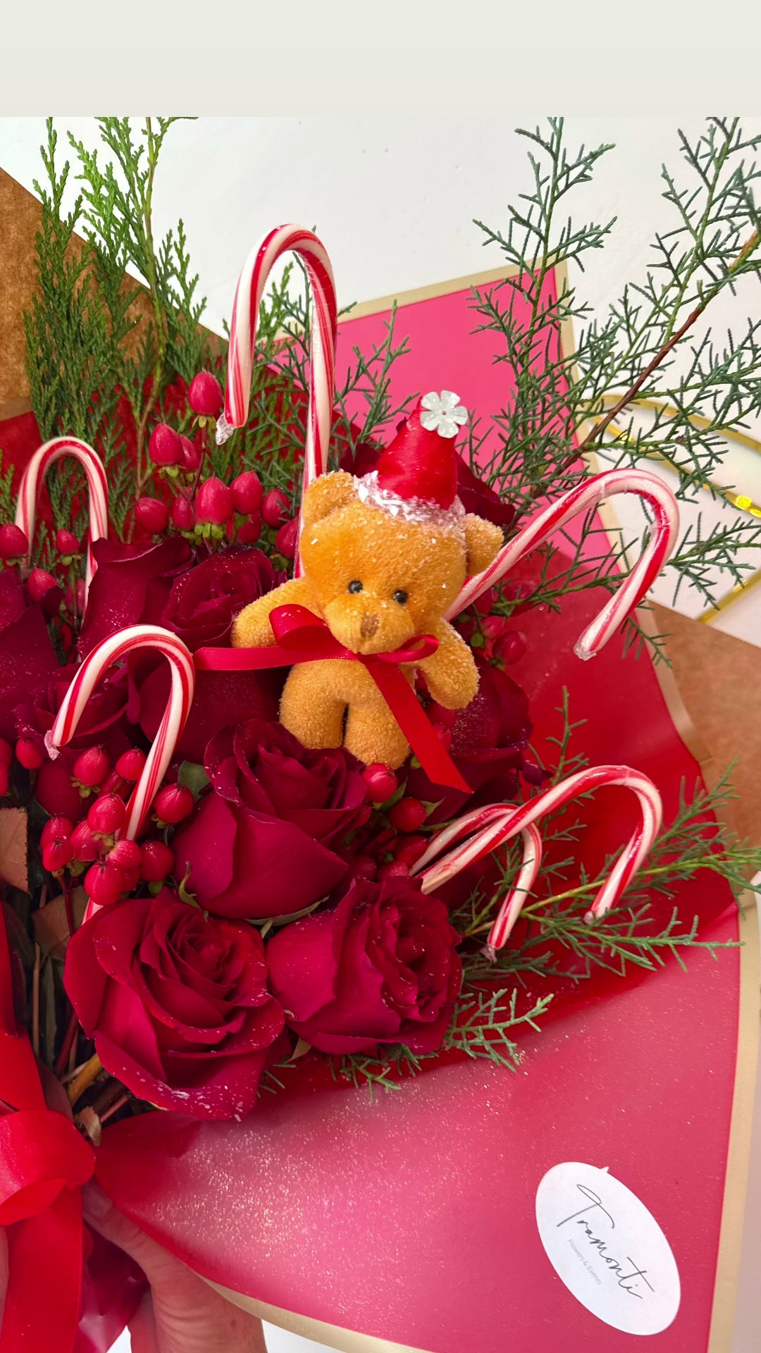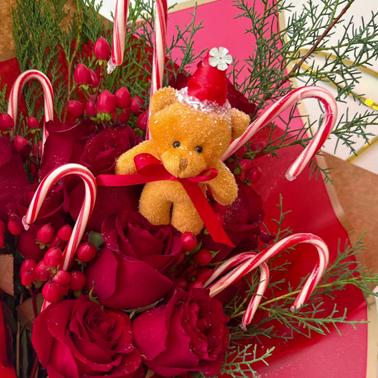 Candy Cane Christmas Roses, It features stunning red roses surrounded by lush seasonal greenery, including pine and cedar, giving it a classic Christmas feel. Festive candy canes add a playful touch of holiday cheer, while the arrangement is beautifully wrapped in kraft paper with red accents and a striking red ribbon. The whimsical snowman peeking out enhances the charm, making this bouquet perfect for spreading warmth and joy during the holiday season.