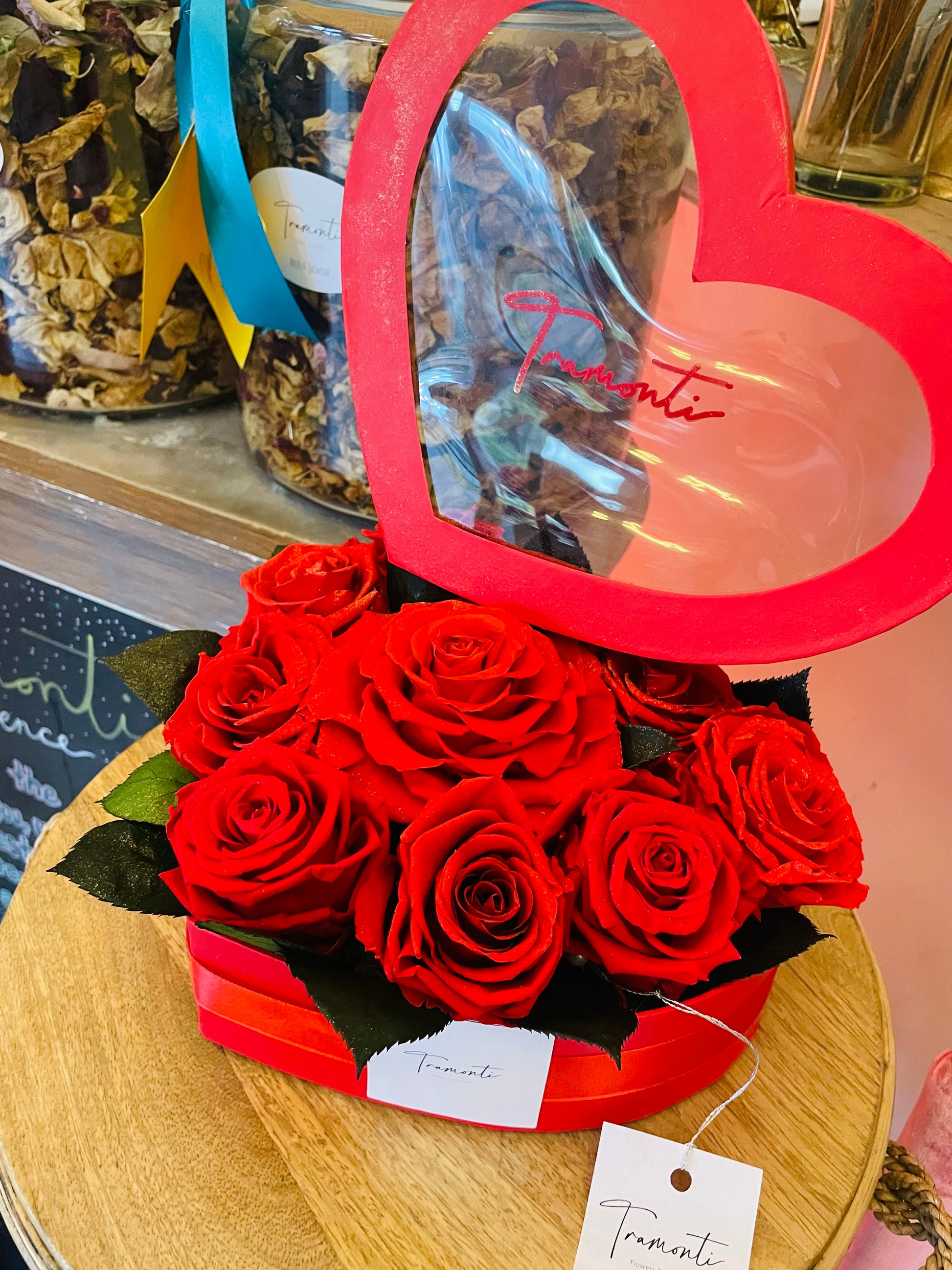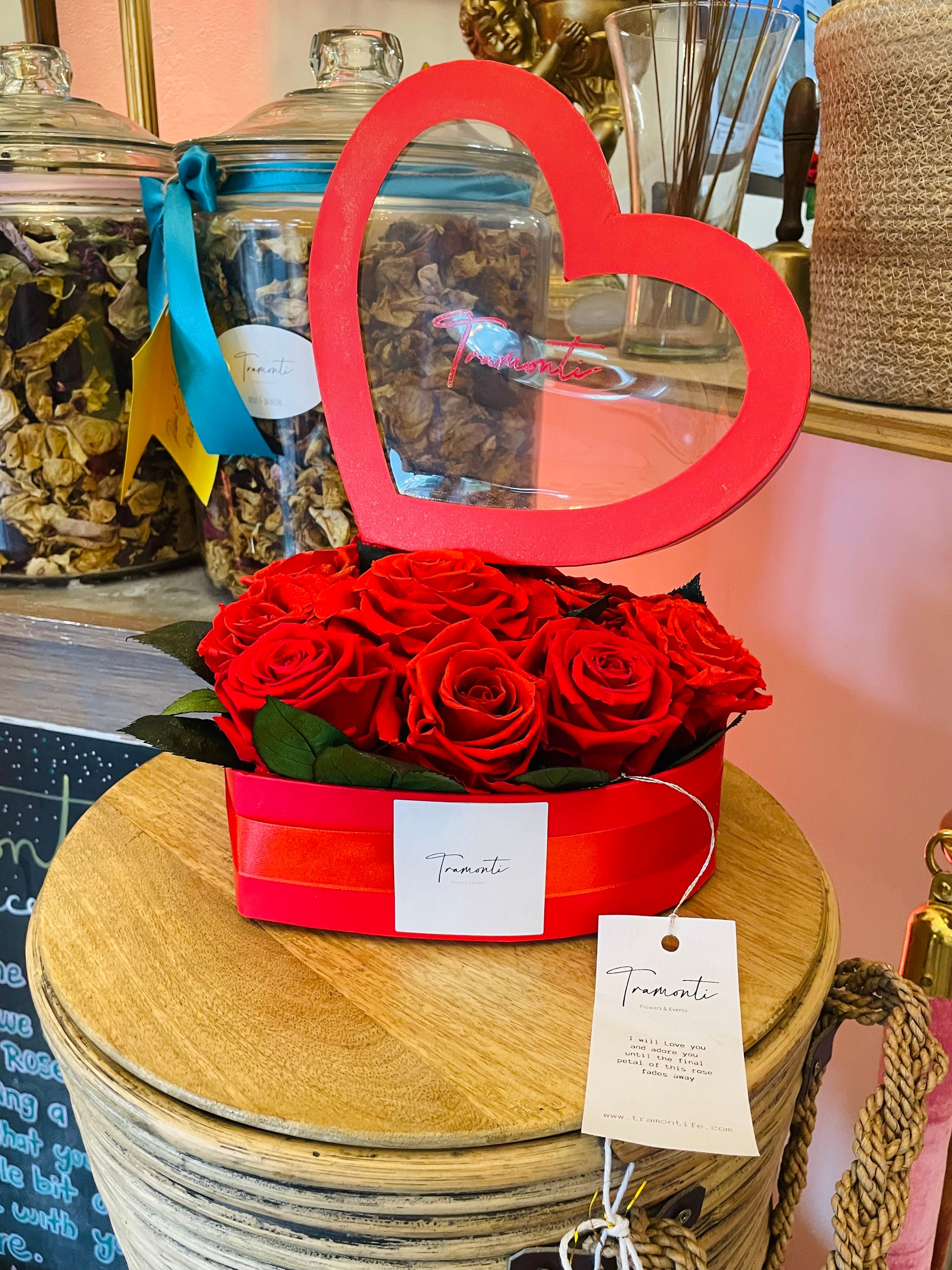 Crimson Everlasting is an elegant arrangement featuring vibrant red forever roses nestled in a luxurious heart-shaped box. Each rose symbolizes eternal love and passion, radiating a rich hue that captures the essence of deep emotions. The heart-shaped box, designed with exquisite craftsmanship, enhances the beauty of the arrangement, making it a perfect gift for romantic occasions, anniversaries, or heartfelt expressions. This stunning piece embodies the timeless nature of love, offering a lasting reminder of cherished moments and profound connections.