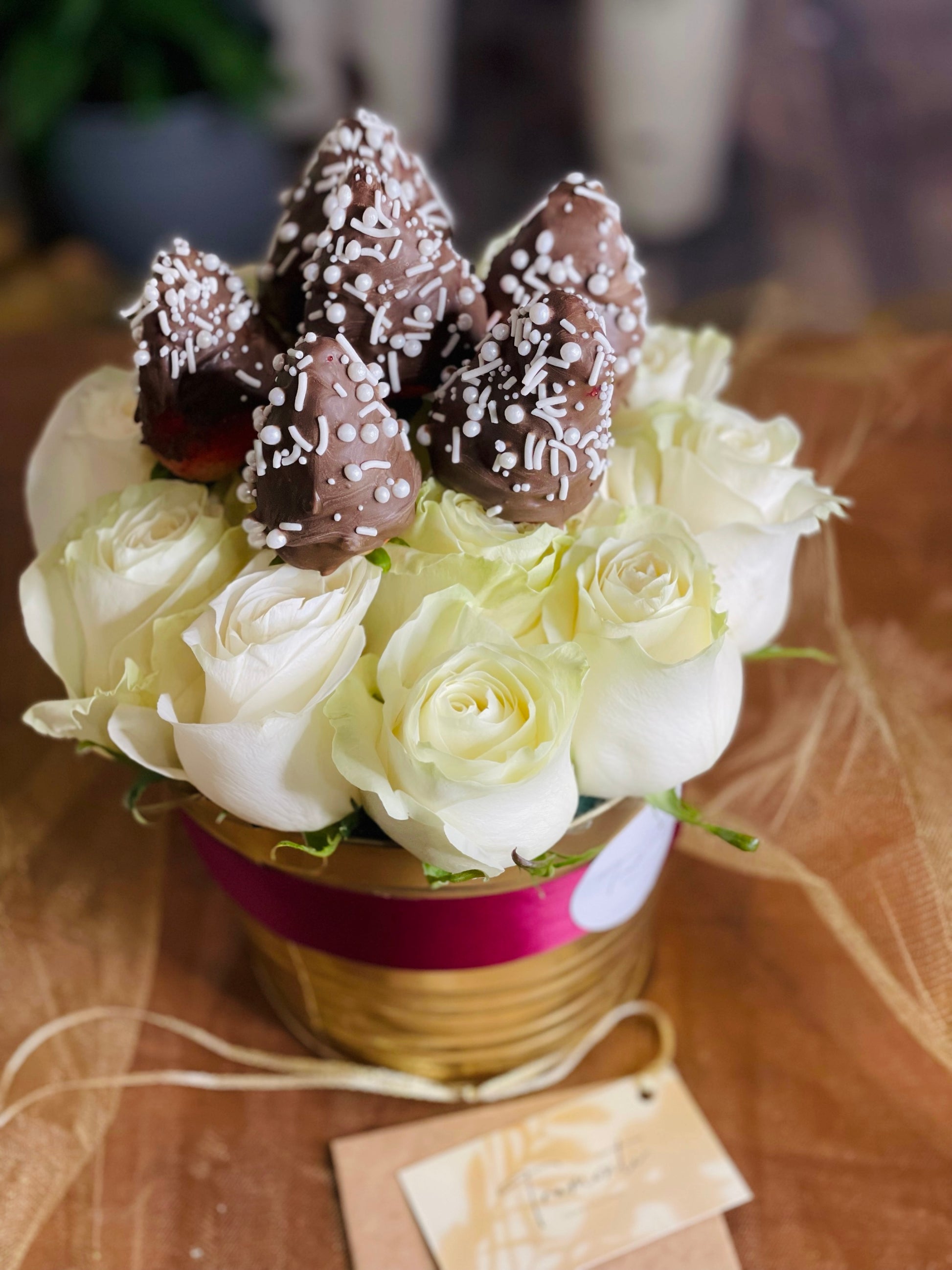 The Encantador White Roses Arrangement is a captivating ensemble that marries the sweetness of delicious strawberries with the timeless beauty of white roses. This combination results in an unforgettable and unique sensory experience, where the luscious taste of strawberries harmonizes with the pure elegance of white roses. Whether for a special celebration or a thoughtful gesture, this arrangement adds a delightful touch to any occasion, creating a sensory symphony that is both visually enchanting and indulgently sweet.