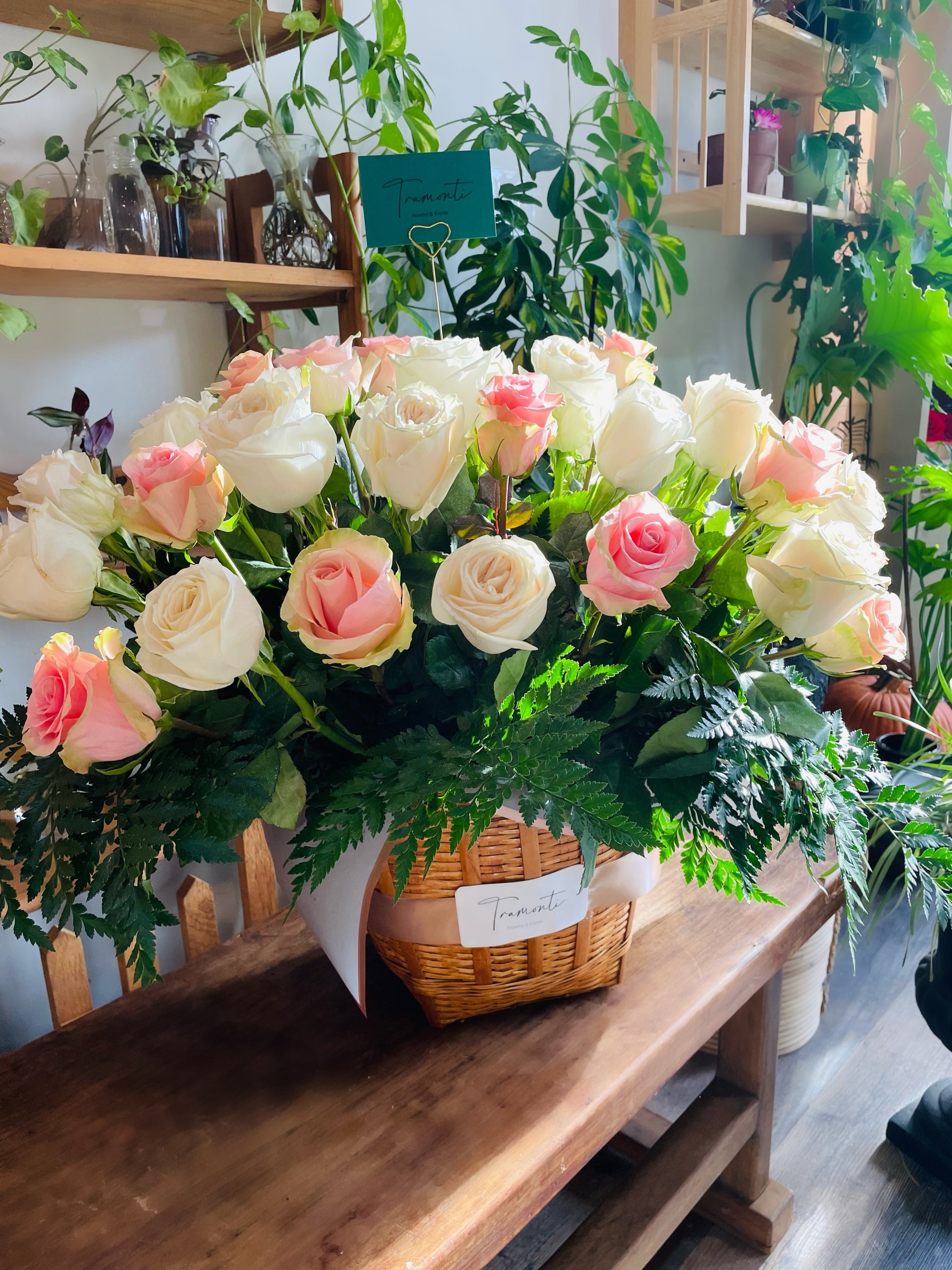 Imagine a captivating basket, intricately woven with a tapestry of emotions, showcasing the timeless elegance of premium white roses alongside the soft, enchanting hues of light pink roses. This floral symphony creates a profound sense of beauty, as if nature itself is orchestrating a magical concerto within the confines of this exquisite arrangement. The delicate dance of petals whispers tales of love and serenity, inviting those who behold it to immerse themselves in the depths of its floral enchantment.
