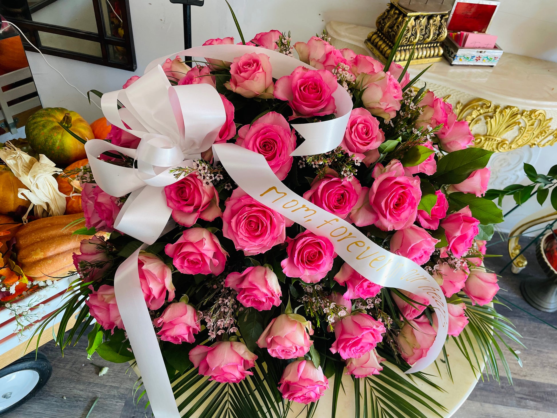 “Eternal Gratitude in Roses” is a heartfelt half-casket arrangement designed to convey deep sympathy and love. This elegant tribute features a harmonious display of vibrant pink roses, each symbolizing love, admiration, and gratitude. The arrangement is thoughtfully crafted with lush lemon leaves and delicate wax flowers, adding a touch of softness and texture that enhances the overall beauty. The pink roses are artfully arranged to create gentle layers, offering a serene and comforting presence that honors the memory of the loved one. This arrangement serves as a poignant expression of support and compassion during a difficult time, embodying both warmth and elegance in its simplicity.