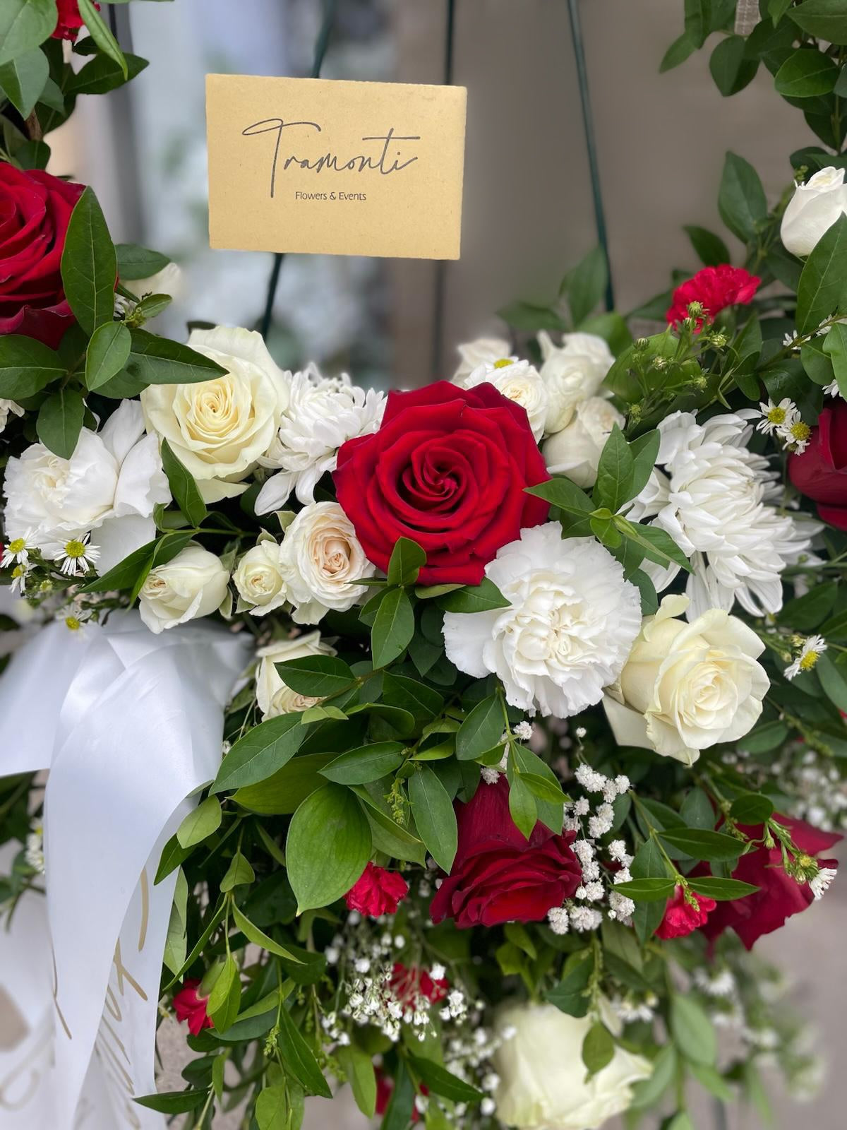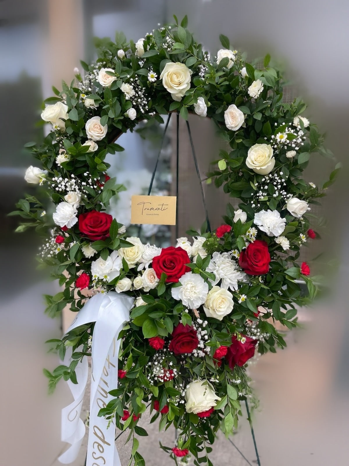 The Eternal Love Crown Standing Spray is a touching tribute that expresses enduring love and remembrance. This arrangement features a lush greenery base that provides a serene and natural background. At its heart, red and white roses are beautifully arranged, symbolizing deep affection and purity. The red roses convey heartfelt love, while the white roses add a sense of respect and reverence. Shaped in a graceful, crown-like design, this standing spray honors the memory of a loved one with an elegant and timeless display.
