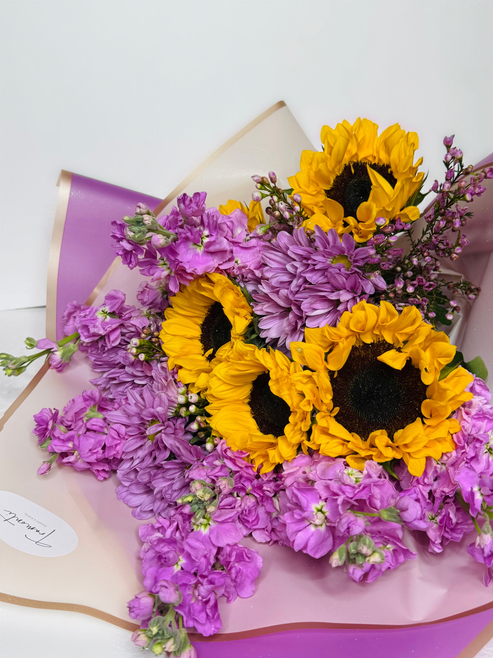 This bouquet is full of Jersey charm—bold, bright, and full of life. Big sunflowers bring warmth, purple stocks add a rich touch, and purple daisies keep it fun. Wax flowers fill in the details, making the whole thing feel fresh and effortless.