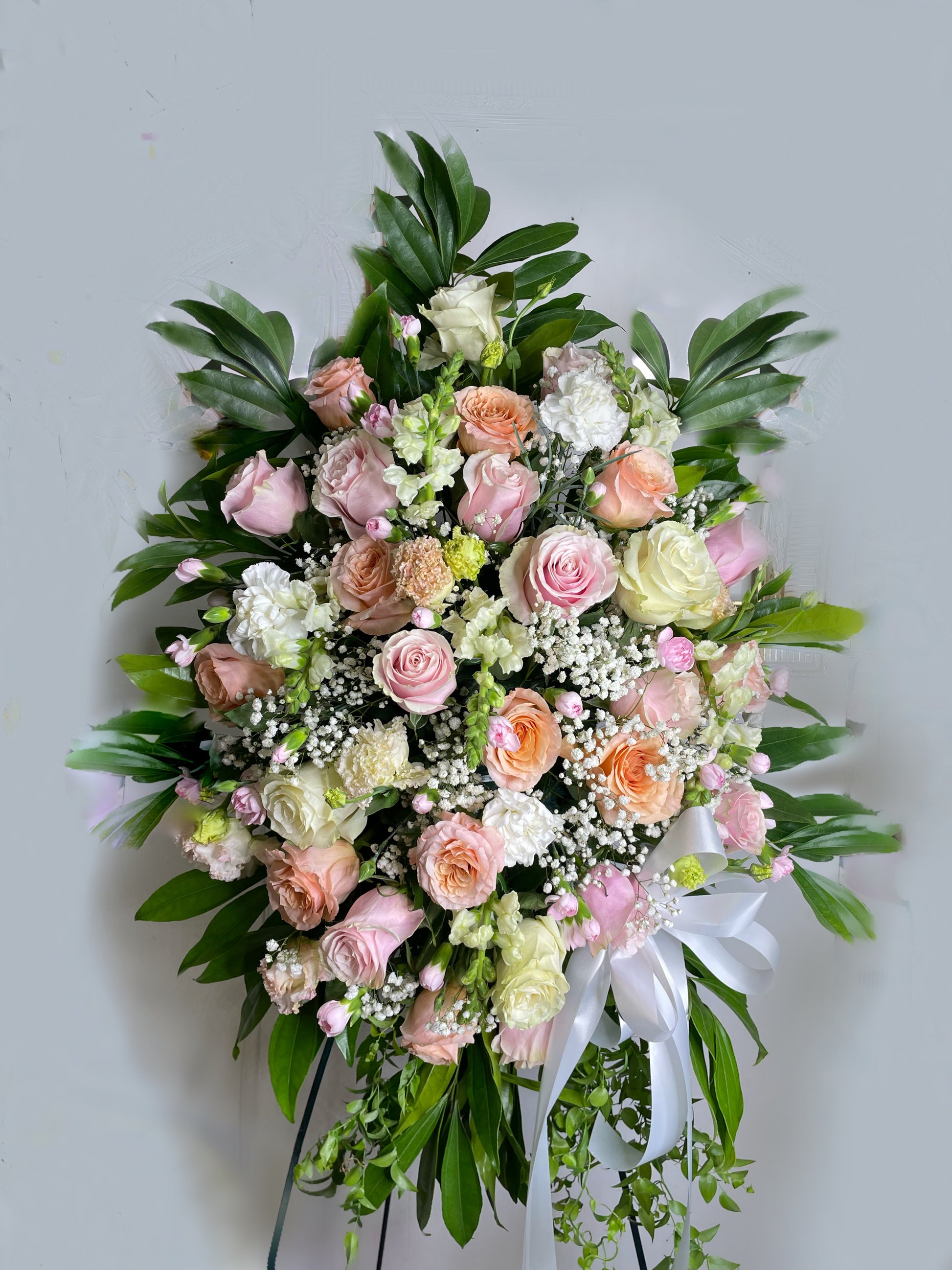 In loving memory of our dearly departed, this sympathy floral arrangement is a poignant blend of exquisite cream-colored roses. Each rose, symbolizing the enduring beauty of our shared moments, is delicately accompanied by the gentle grace of baby's breath, the subtle elegance of mini carnations, the comforting presence of stocks, and the timeless allure of lisianthus. Together, these blooms intertwine to create a garden of solace, invoking the most beautiful memories we hold dear. May this arrangement stand as a tribute to the love and warmth our loved one brought into our lives, a living memorial to their enduring spirit.