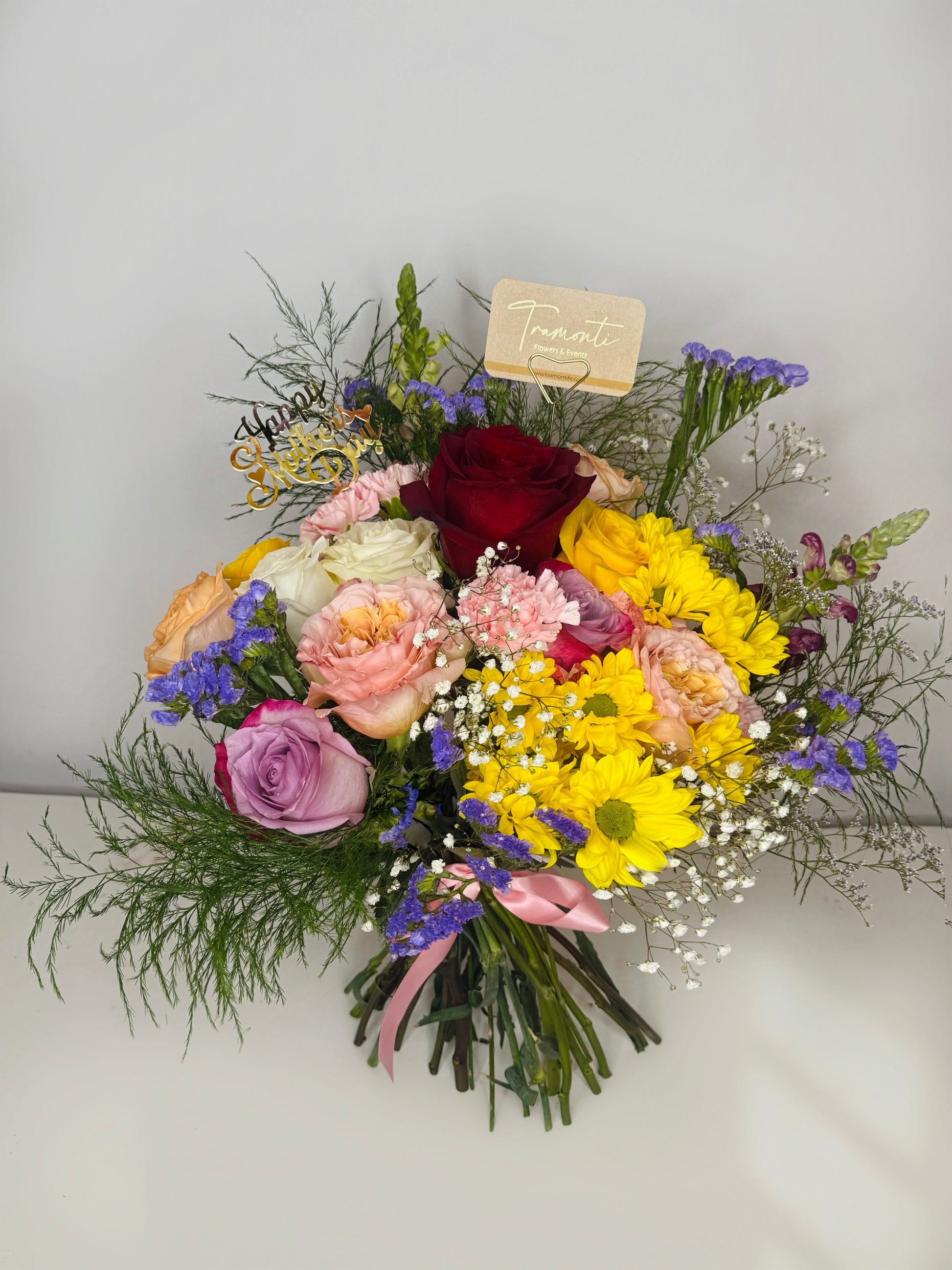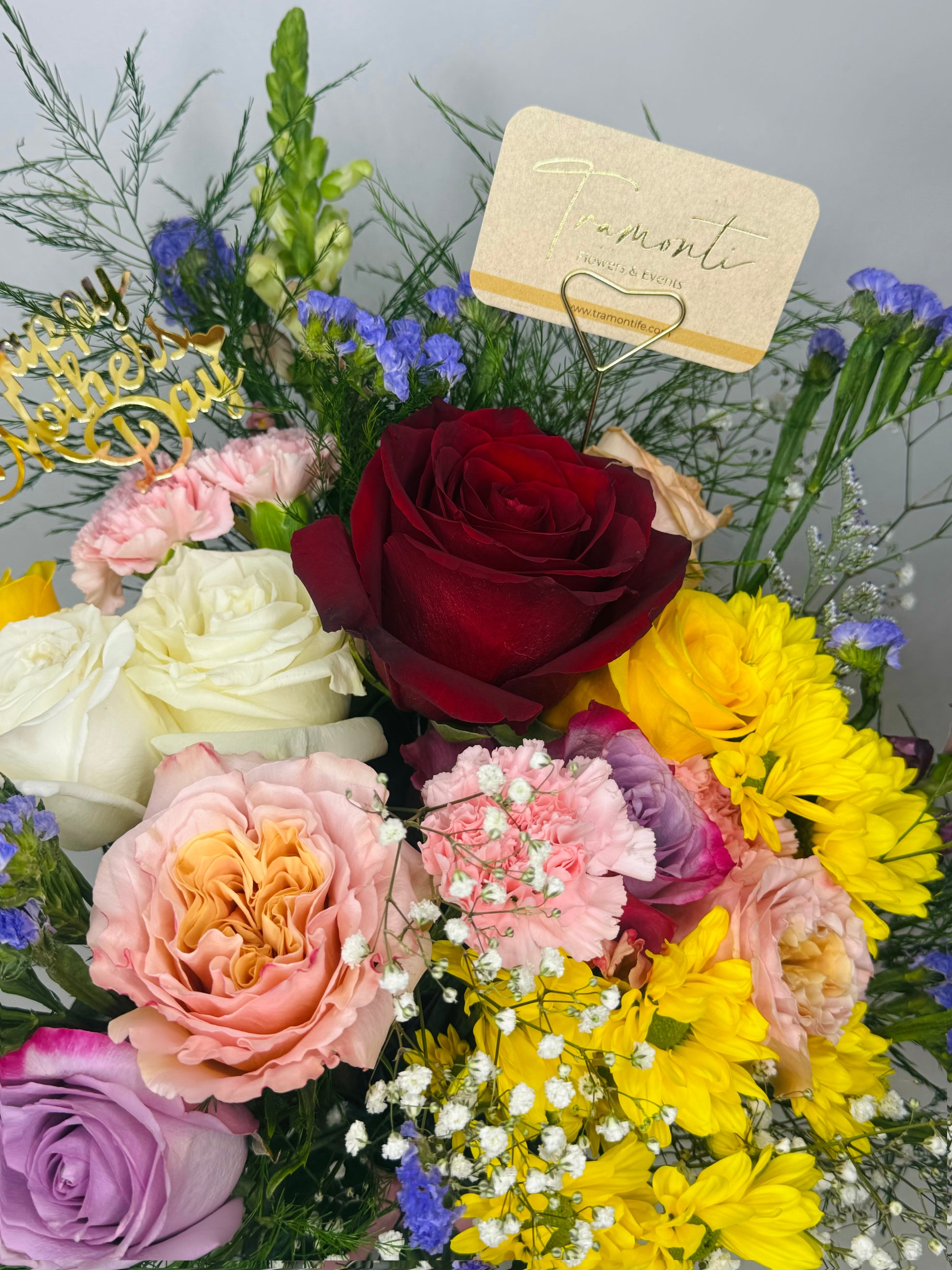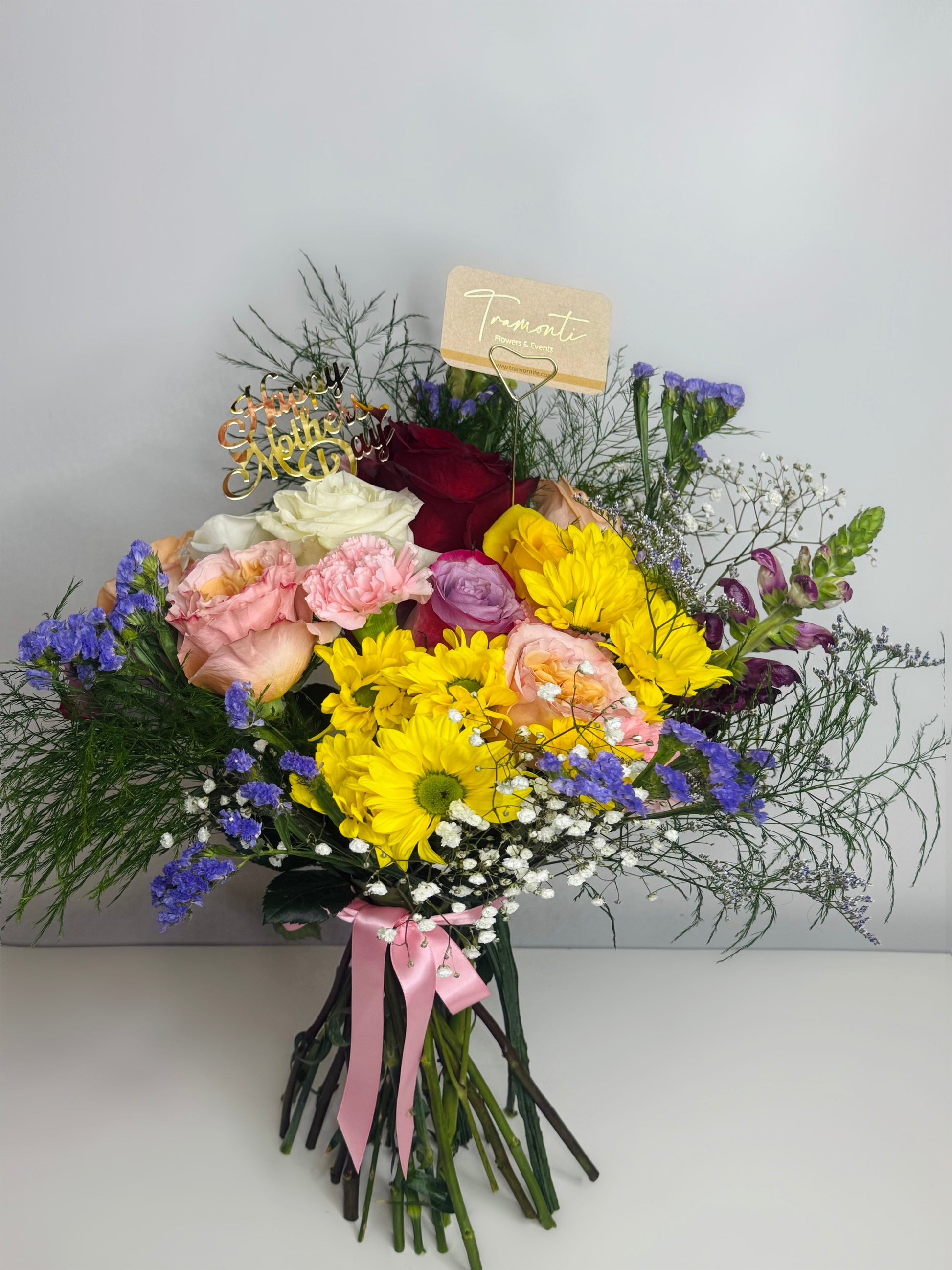 Celebrate Mother’s Day with this cheerful and heartfelt bouquet, bursting with vibrant colors that express joy, gratitude, and love. Featuring radiant yellow daisies, soft peach blooms, delicate purple and white flowers, and a single striking red rose at the center—symbolizing the deep, enduring love of a mother—this arrangement feels like a freshly picked gift from a blooming spring garden.