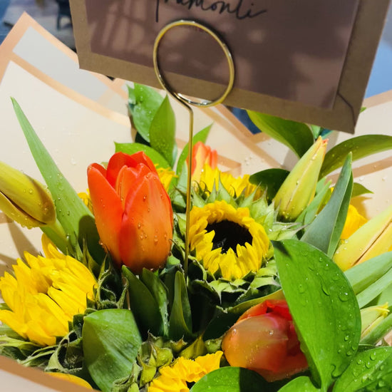 6 sunflowers and 6 tulips with greens wrapped in paper with ribbon