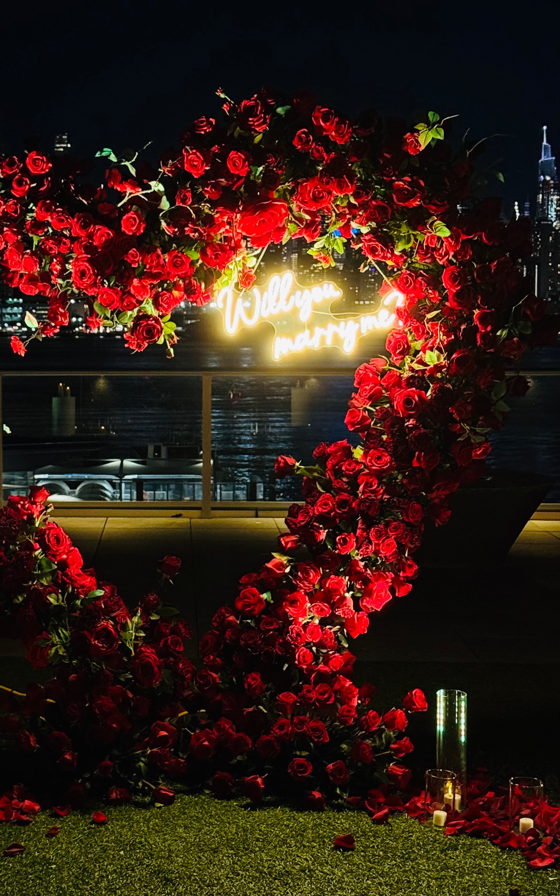 • A glowing “Will You Marry Me” LED sign, surrounded by warm, flickering candles, setting the mood for an emotional and intimate proposal.