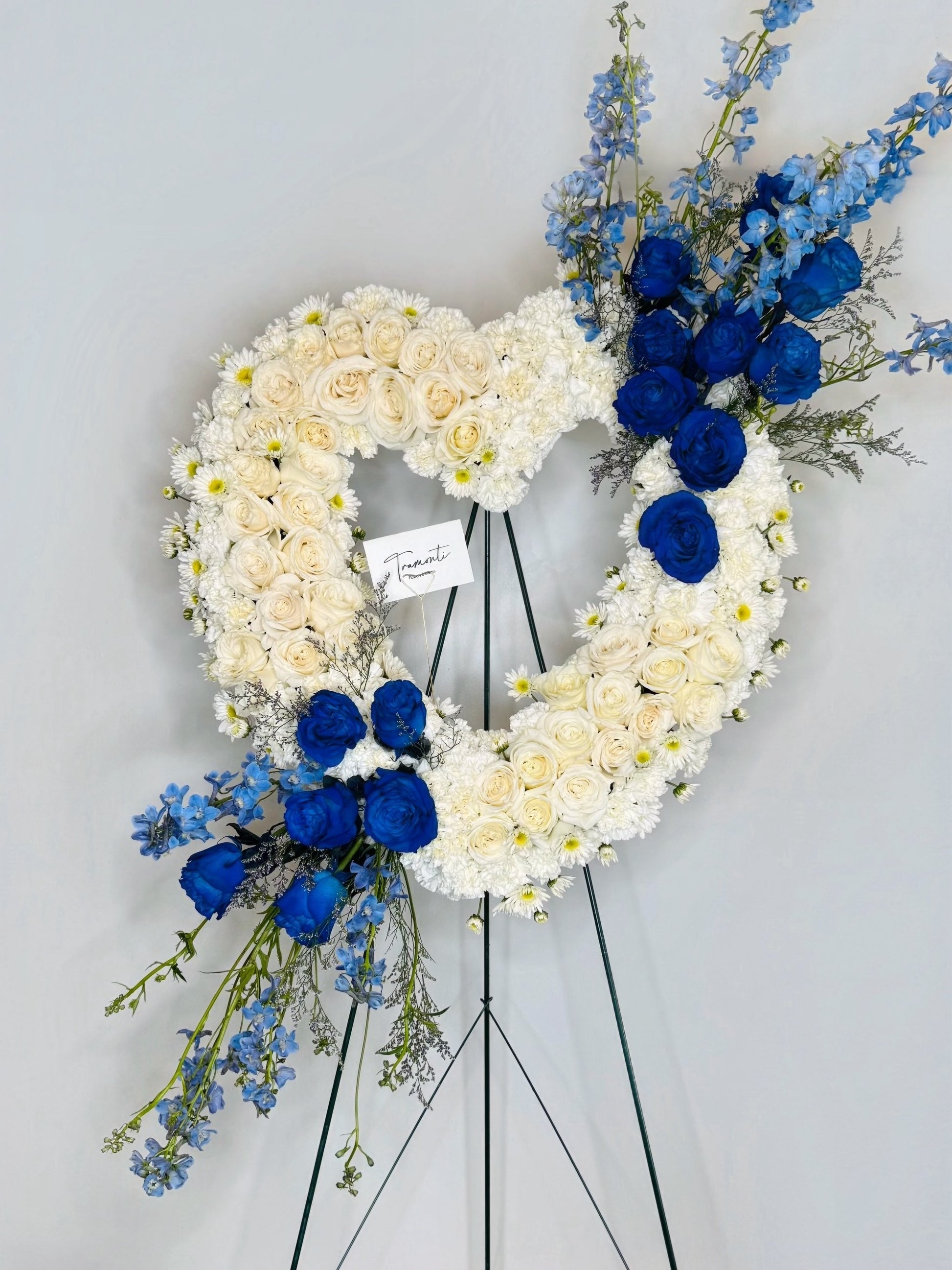 A striking element of this tribute is the floral arrow that gently crosses through the heart, formed with rare blue roses and soft blue delphiniums. The arrow represents love’s enduring journey—even through sorrow—while the tranquil blue hues evoke calm, remembrance, and spiritual depth.