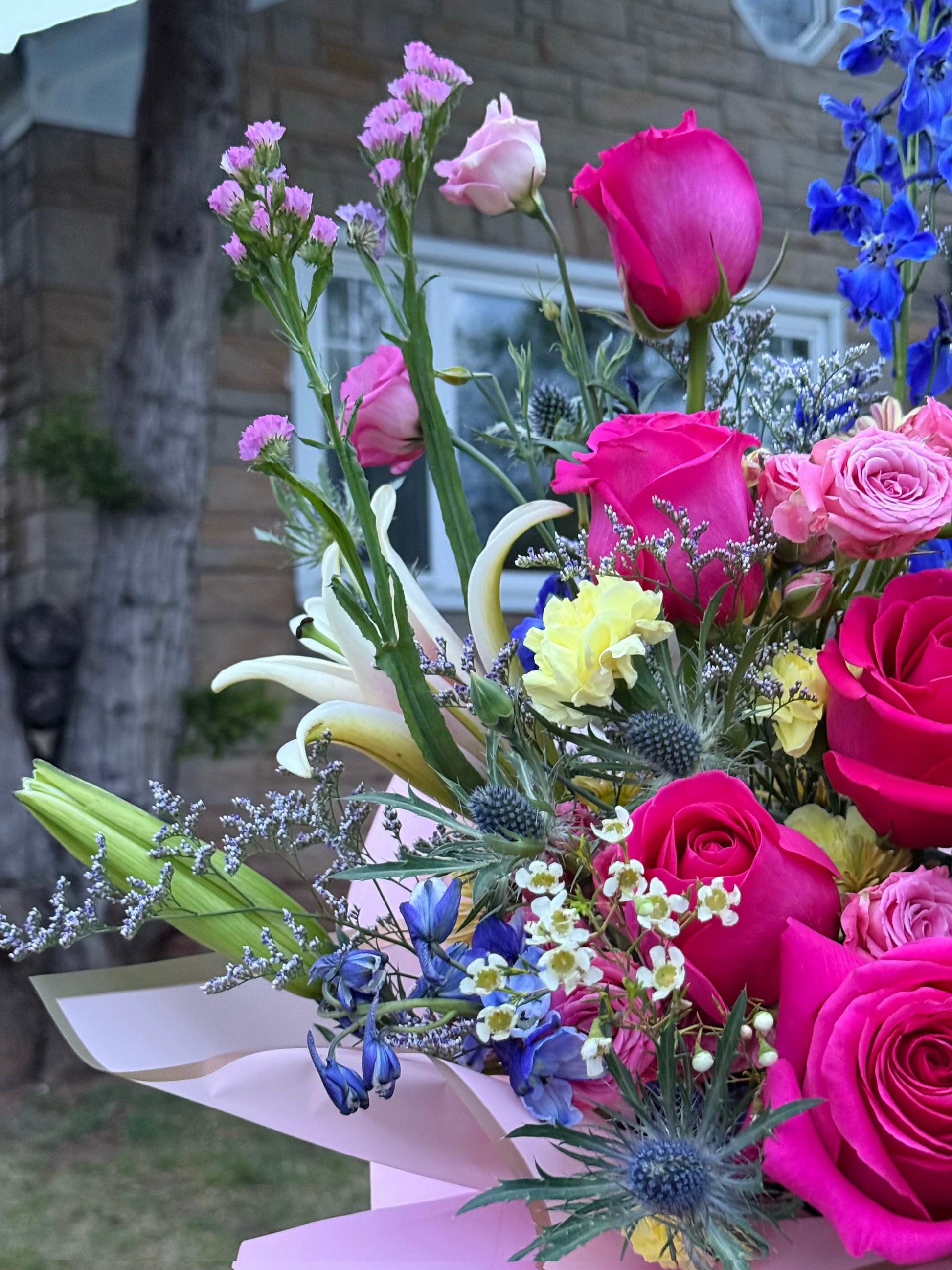 Helena’s Garden Embrace is a vibrant floral arrangement that celebrates the nurturing beauty of a mother’s love. Featuring bold shocking pink roses intertwined with a charming mix of seasonal wildflowers, this design radiates happiness, warmth, and affection. Like a walk through a sunlit garden, each bloom offers a tender reminder of comfort, care, and the joy that only a mother’s embrace can bring.