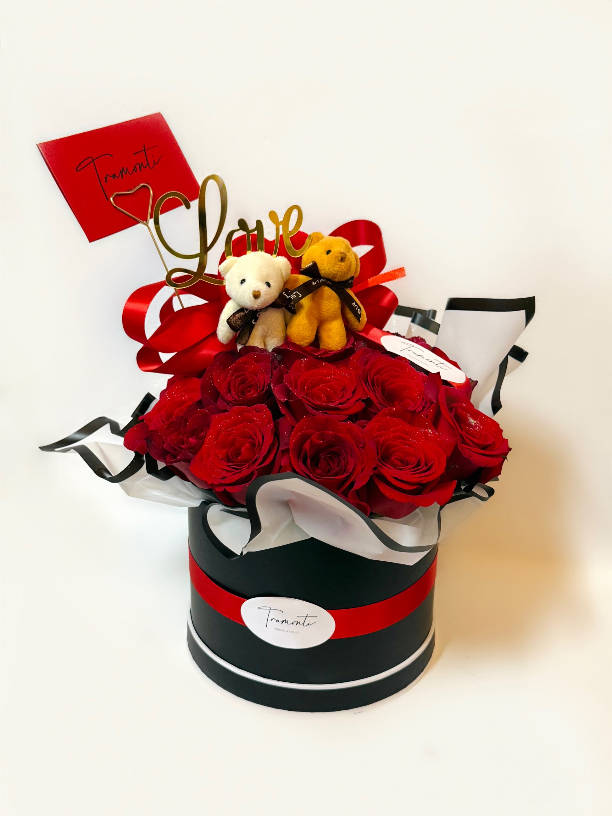 Immerse yourself in the romance of a breathtaking sunset with this charming arrangement. Our Roses Sunset is a delicate and unique creation, featuring radiant red roses carefully arranged in a charming box, symbolizing deep love and passion. Next to them, two adorable miniature teddy bears with soft fur and red bows add a touch of warmth and tenderness, making this gift even more heartfelt.