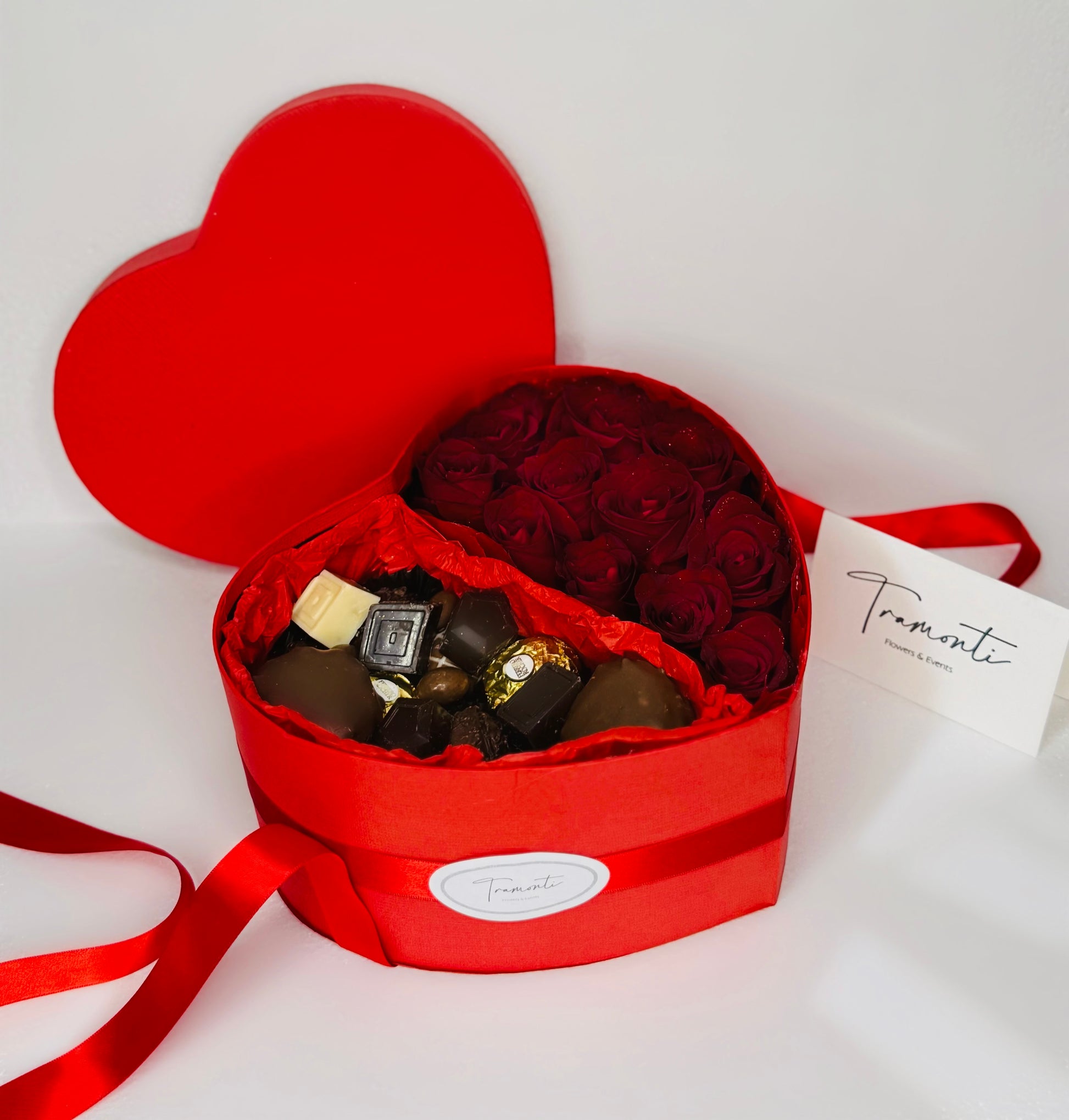 Our Valentine's Cupid Collection, Passion in Bloom, is thoughtfully designed to enchant and celebrate the special person in your life. This breathtaking arrangement features premium, hand-selected red roses that symbolize deep love and passion, beautifully crafted in an elegant red heart-shaped box. To add an extra touch of indulgence, we've included an exquisite selection of gourmet chocolates, carefully chosen to delight the senses. Every detail of this arrangement promises to captivate and steal the heart of your beloved, making it the perfect gift to express your deepest emotions and create unforgettable memories this Valentine's Day.