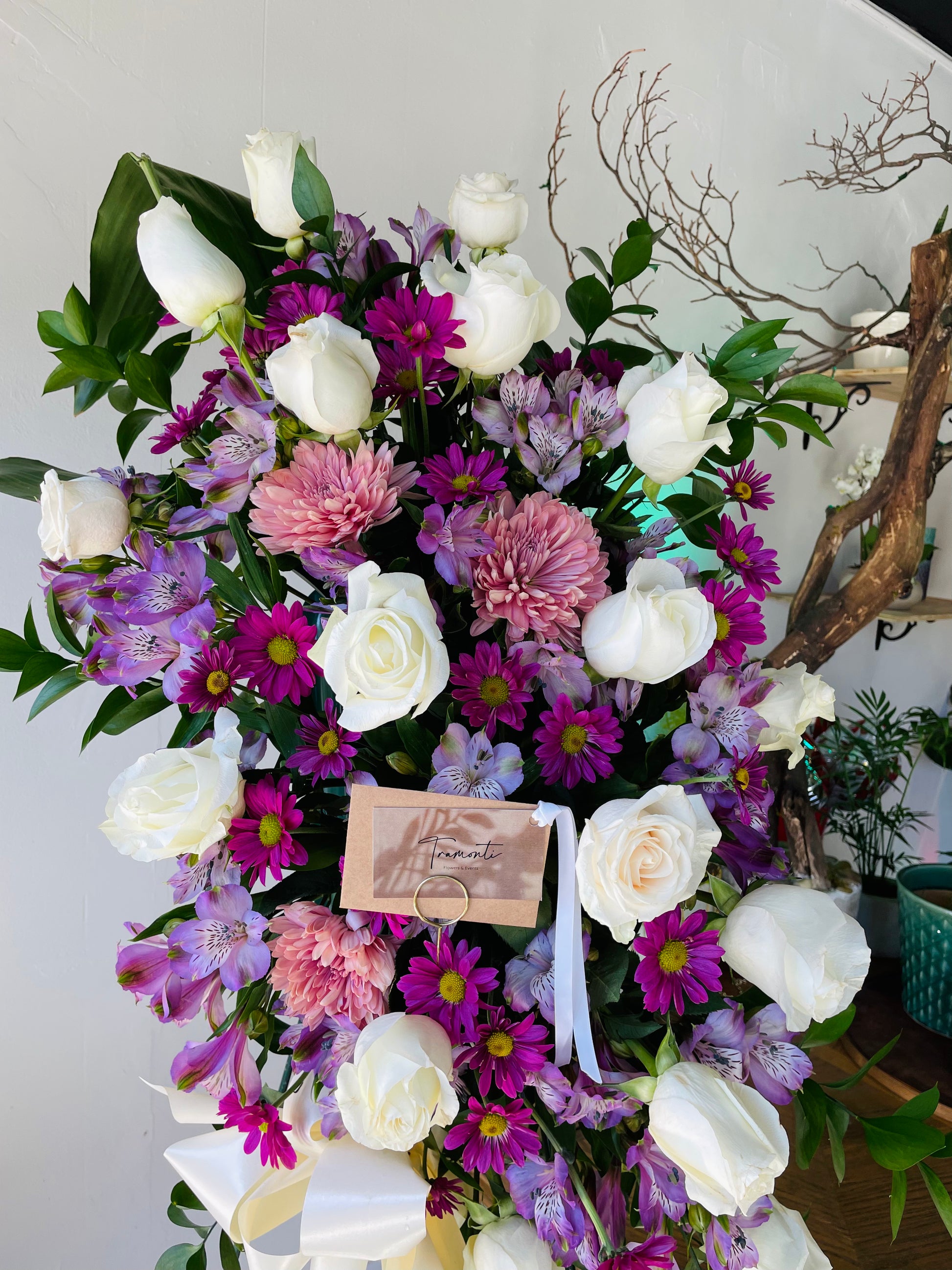 In this beautiful Purple Standing Spray crafted for a funeral, delicate white roses gracefully intertwine with a plush cushion, creating a poignant symbol of remembrance. The regal presence of purple asters adds a touch of solemn elegance, while the gentle sway of purple daisies imparts a sense of tranquility. As a final touch, a pristine white ribbon elegantly weaves through the arrangement, symbolizing the purity of cherished memories. This thoughtful composition stands as a heartfelt tribute, offering solace and beauty in a time of remembrance.