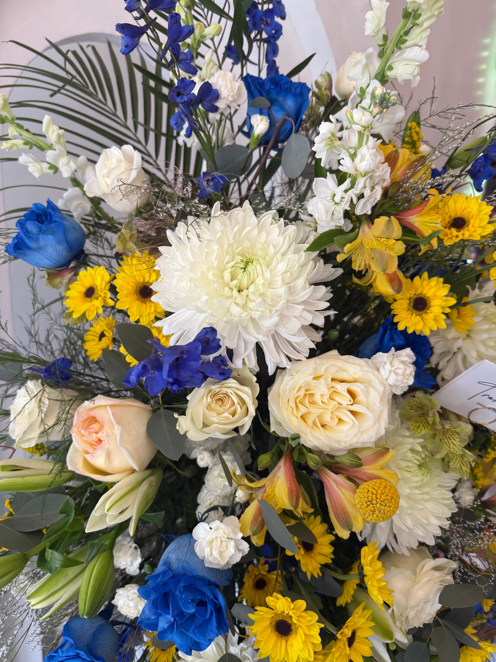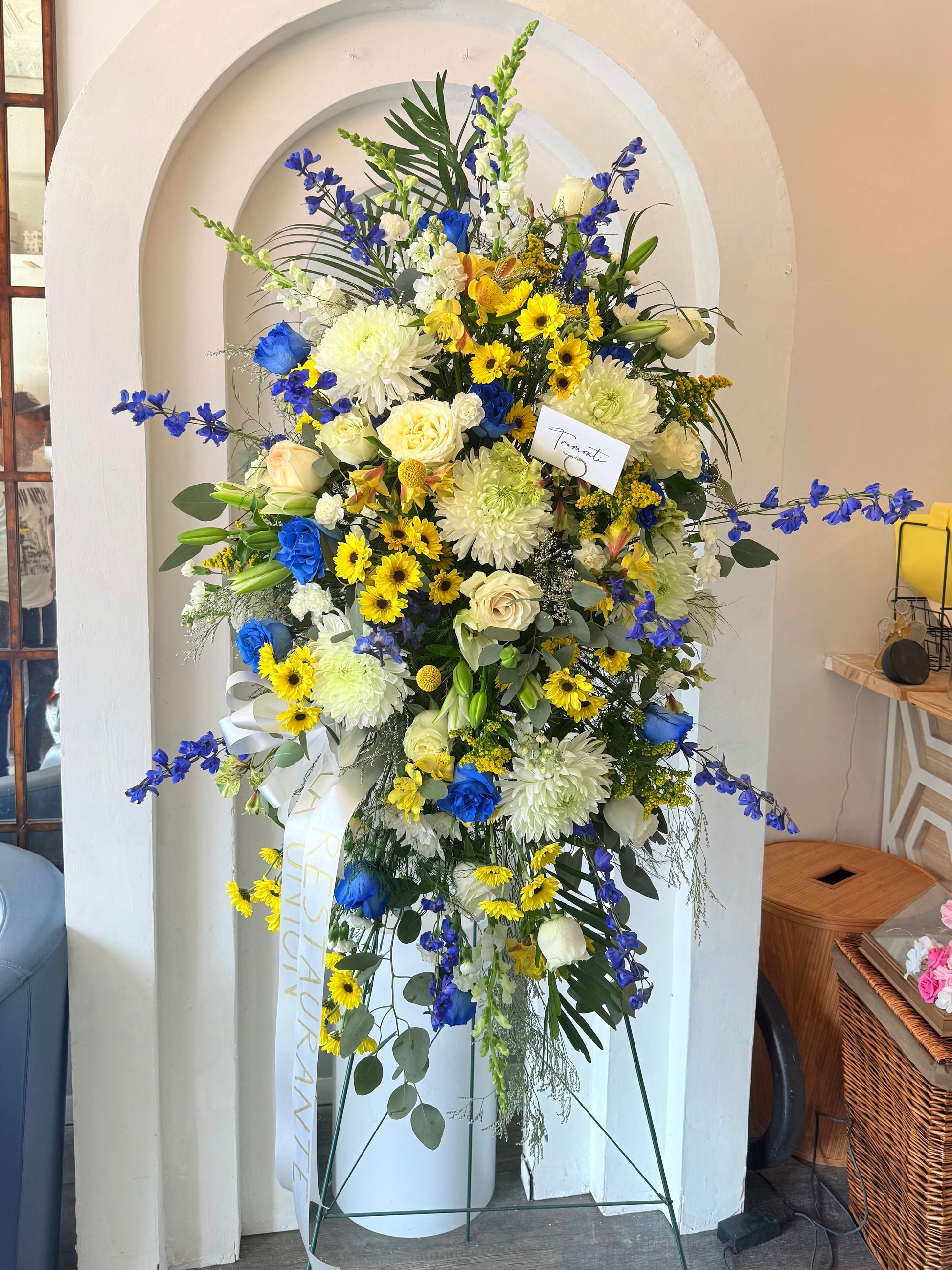 A graceful and comforting standing spray designed in calming tones of white, blue, and yellow. It features lush white chrysanthemums symbolizing honor and remembrance, elegant blue delphiniums that bring a sense of peace and serenity, radiant yellow blooms representing warmth and light, and classic roses for love and respect. This arrangement offers a gentle, uplifting tribute that conveys sympathy, hope, and heartfelt remembrance.