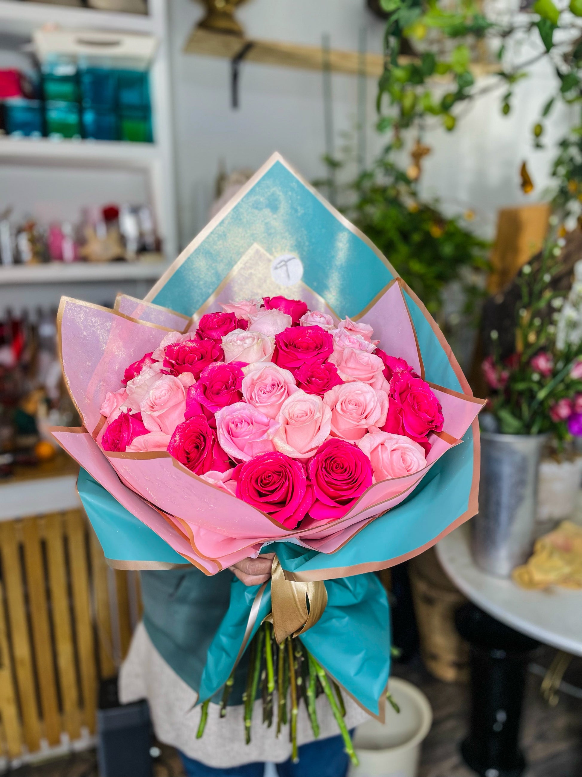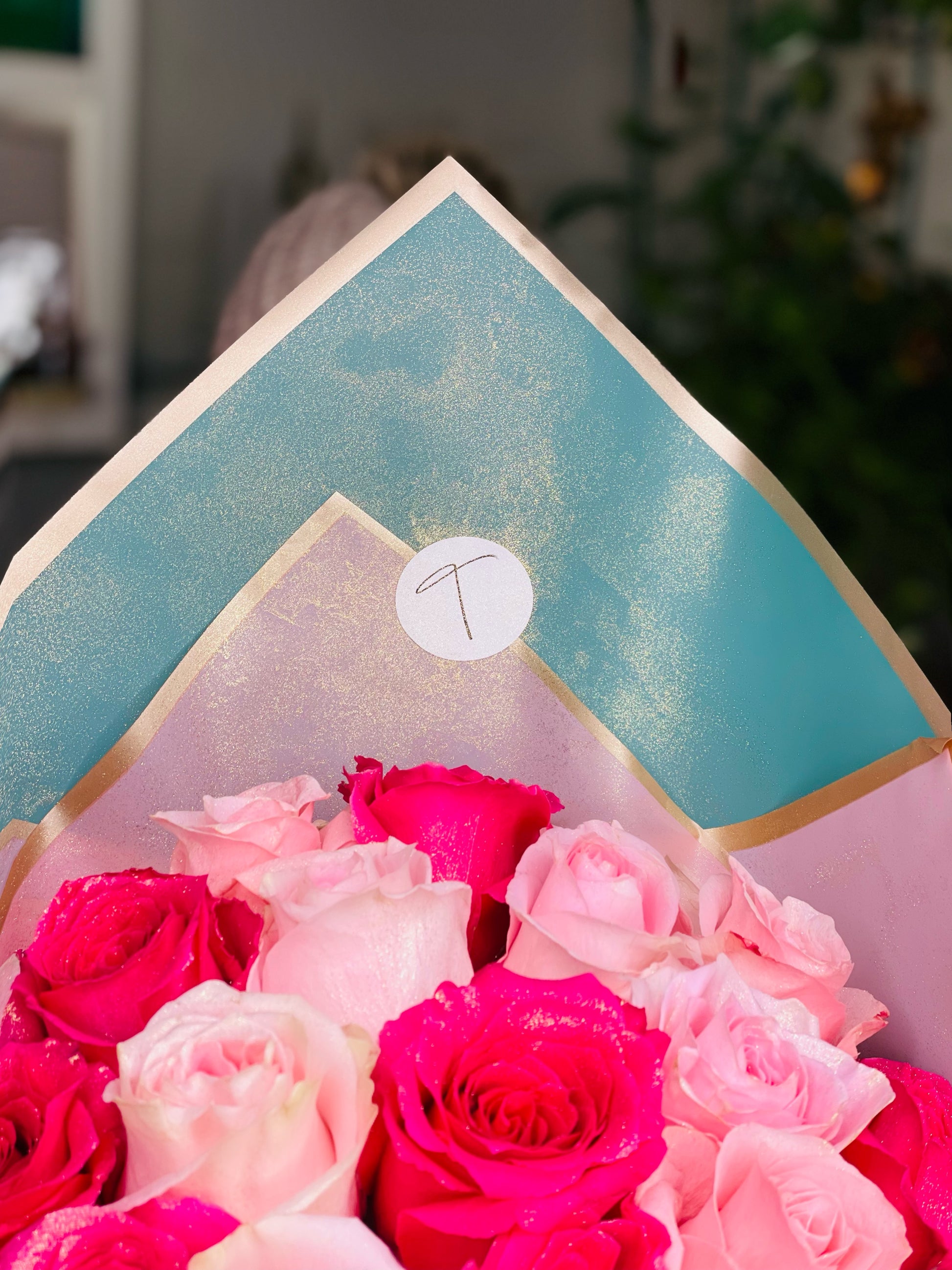 Gathered in a dance of hues, tender roses blush in assorted pinks, embraced by the soft caress of pink and turquoise blue. A romantic ensemble, delicately wrapped, awaits to captivate, mirroring the essence of your enchanting smile.