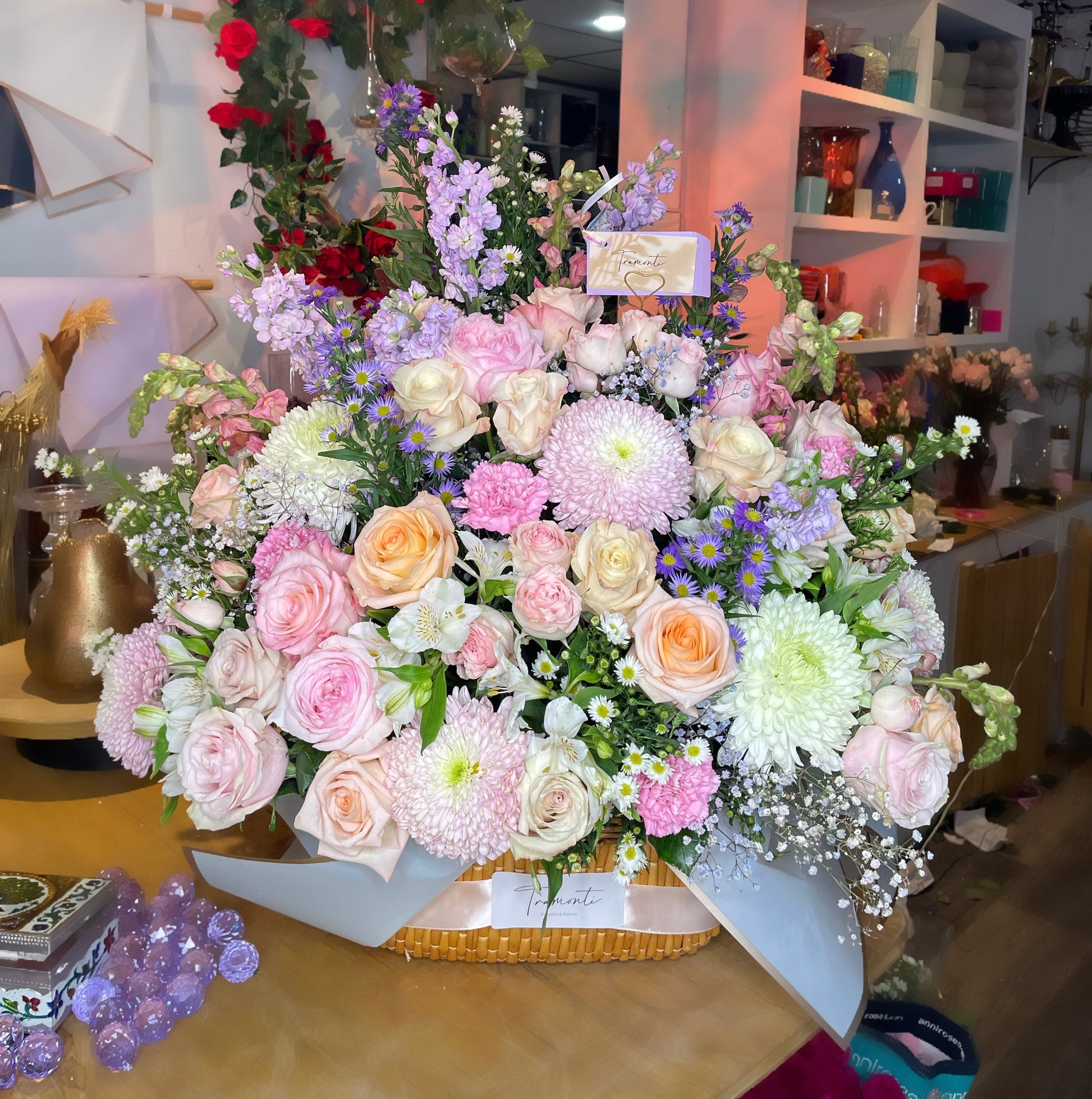 Introducing our enchanting creation, the Sophie Blooming Basket! Embracing soft pastel shades of pink, lavender, and delicate peach, this arrangement is a dream-like addition to any space. Beyond its visual allure, the blooms emanate a magical fragrance, making the Sophie Blooming Basket a perfect and thoughtful gift for various occasions. The charming blend of colors and scents transforms this basket into a delightful sensory experience.