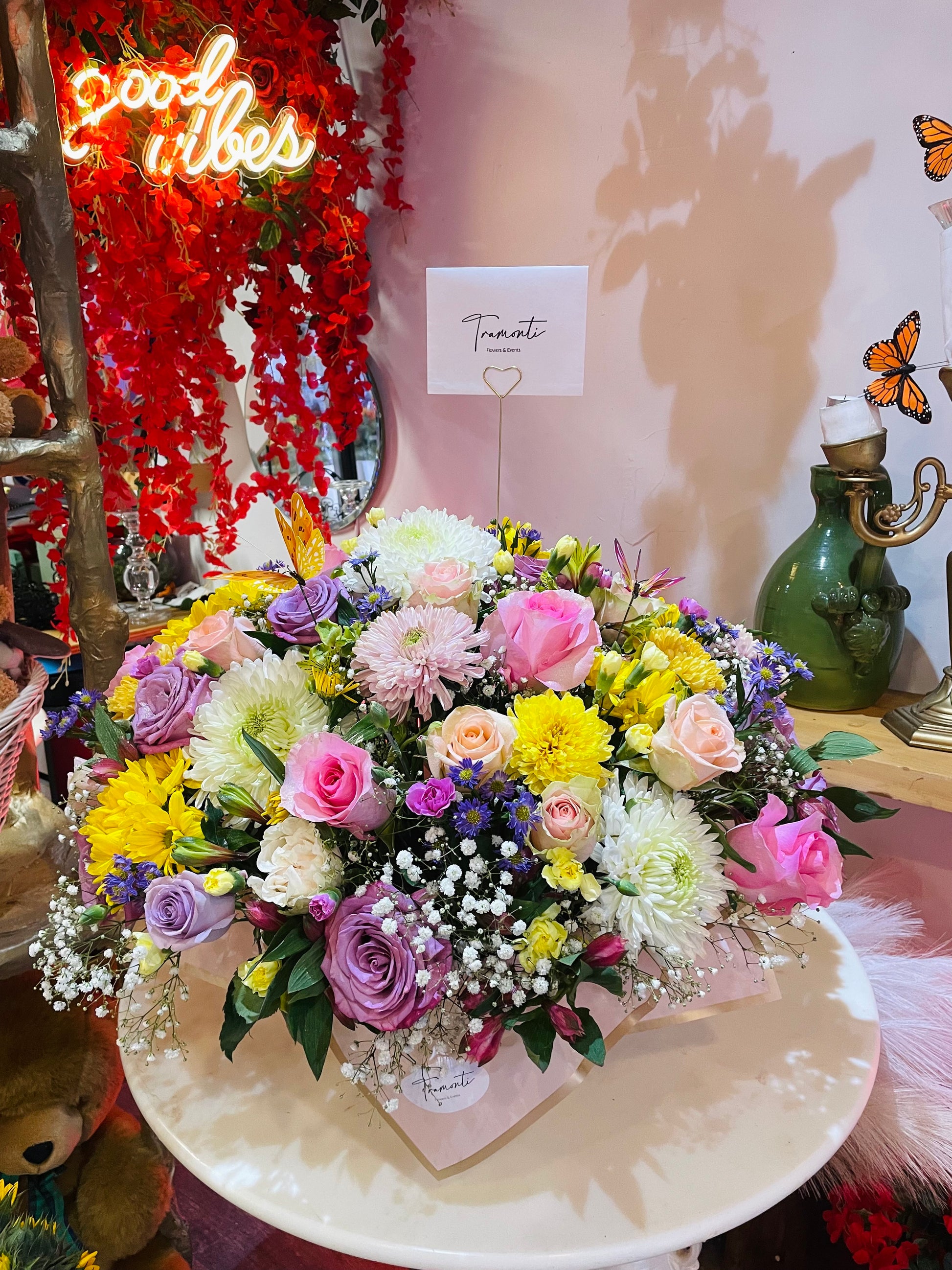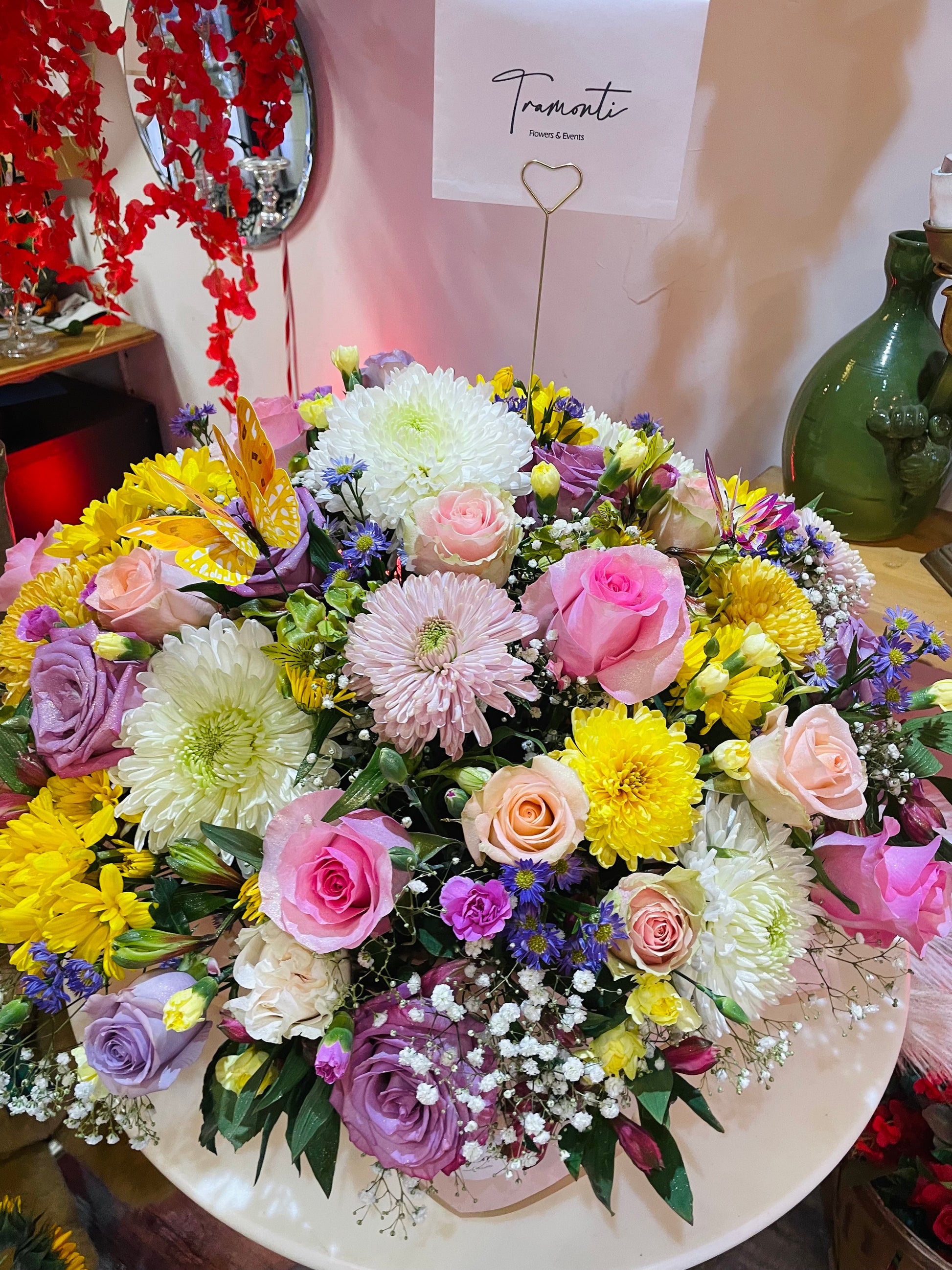 Introducing Our Enchanting Spring Garden, Mixed Flowers:Elevate any occasion with our exquisite Basket of Mixed Flowers, meticulously curated to captivate and enchant. This stunning arrangement features a harmonious blend of:Luxurious RosesSoft Cushion PomsVibrant AstersElegant Monte CasinoDelicate Baby's BreathEnhanced with whimsical butterfly decorations, this basket is not just a floral arrangement but a visual symphony that promises to mesmerize and delight. Perfect for gifting or as a centerpiece, our Enchanting Basket of Mixed Flowers is a testament to nature's beauty and the art of floral design.Experience the magic today and let your surroundings be transformed into a realm of enchantment and elegance.Would you like to proceed with this description or make any adjustments?