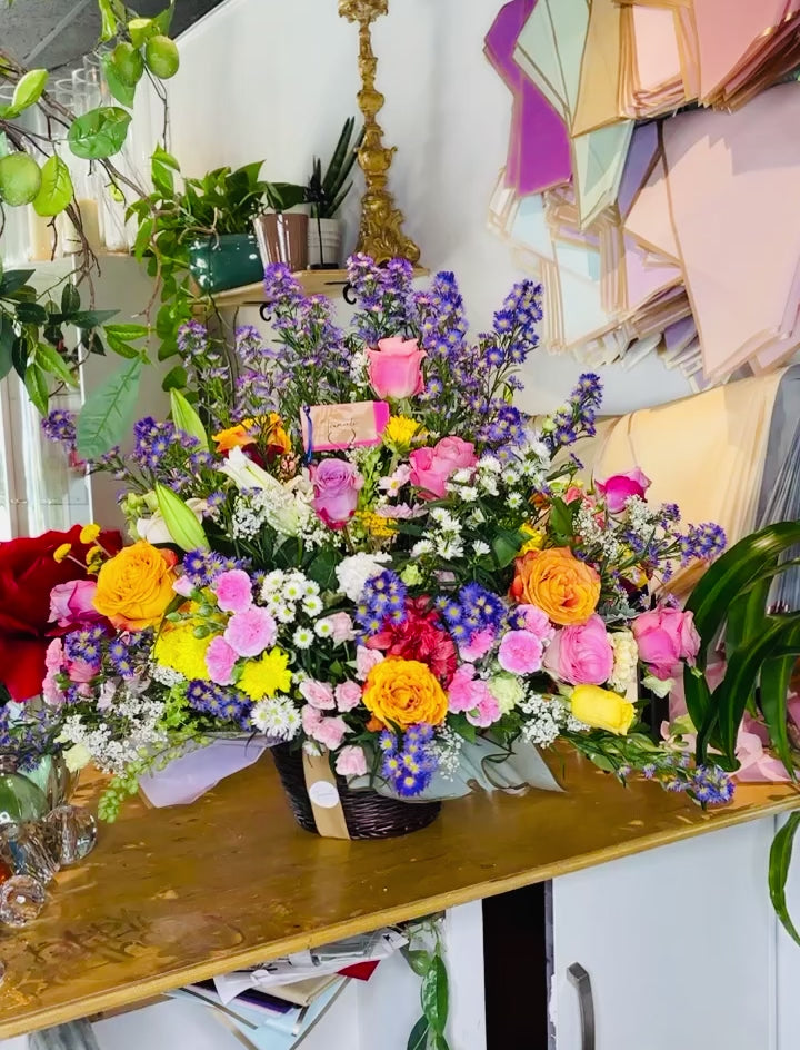 "Peacock Blooms" not only uplifts with its cheerful combination of wildflowers, assorted roses,Lilies and the lively touch of either purple Monte Casino or blue Delphiniums but also adds an artistic dimension. This floral arrangement is crafted as a joyful work of art, enhancing your space with both vibrant colors and creative expression.