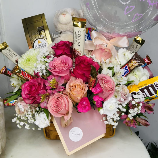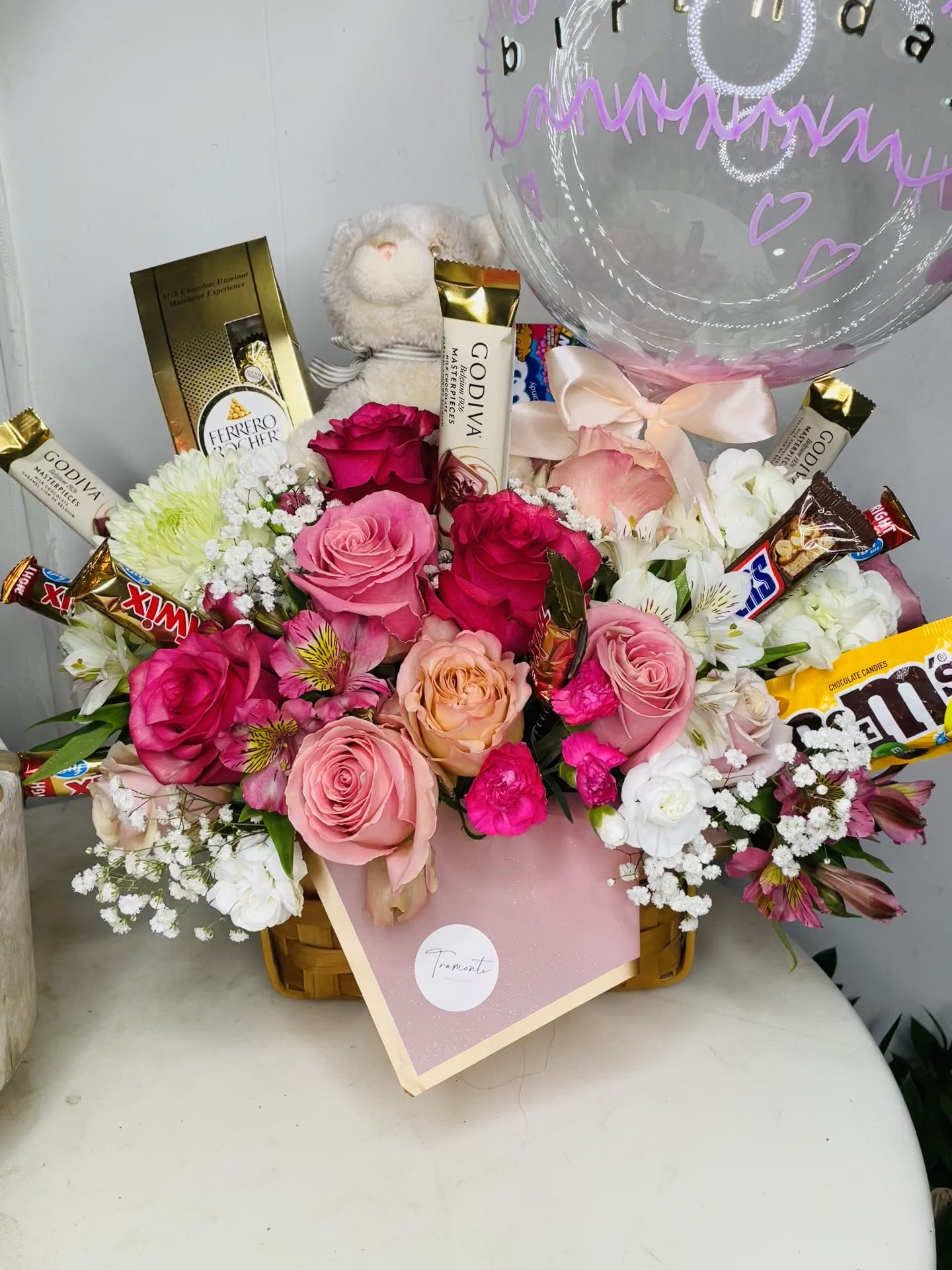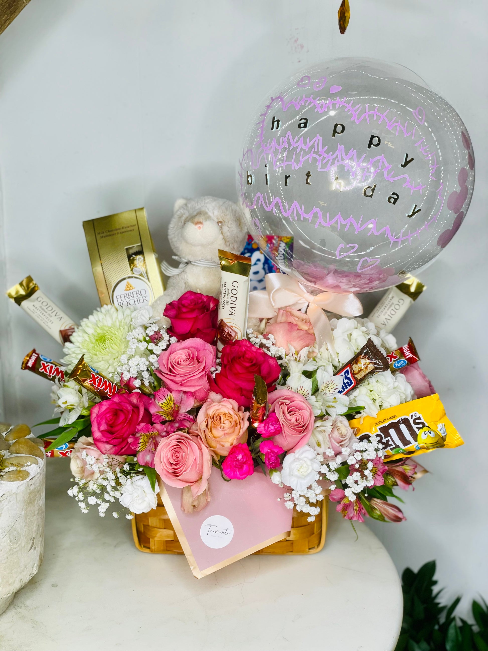 The "Sweet Blooms & Cuddles Gift Basket" is a delightful ensemble featuring a variety of roses and flowers, accompanied by a charming teddy bear 🧸, an assortment of delectable chocolates, and a festive balloon. This thoughtfully curated gift embodies a perfect blend of floral beauty, sweetness, and a touch of playful celebration. It's a heartwarming gesture that combines visual appeal with delightful treats.