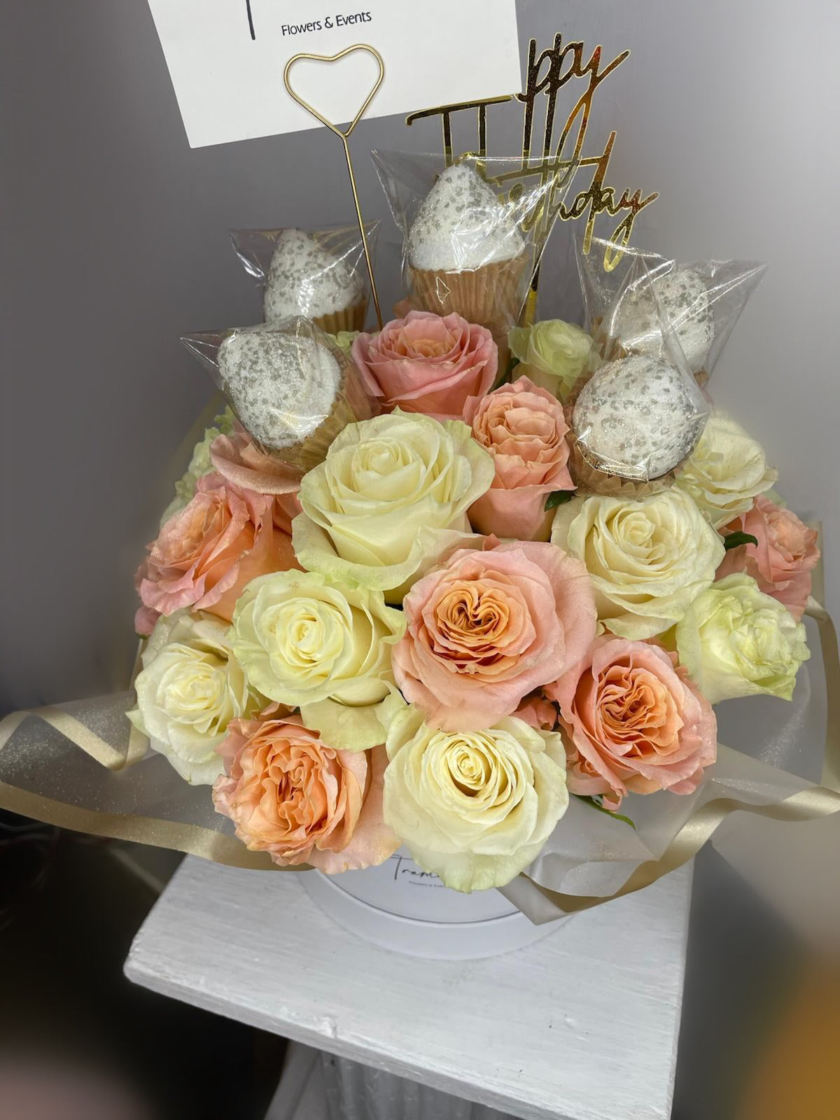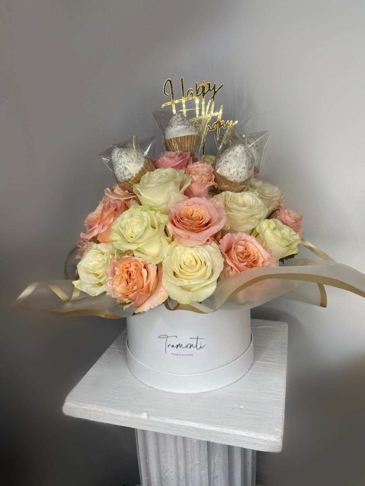 Sweet Mountain Delights is a stunning floral arrangement presented in a chic, round white box. The display features an elegant mix of pristine white roses and soft peach roses, creating a gentle, romantic contrast. Nestled among the blooms are decadent white chocolate-covered strawberries, adding a touch of indulgence. Atop the arrangement rests a gold birthday sign, offering a festive and celebratory touch. The composition radiates a sense of luxury and joy, making it the perfect gift for a special occasion.