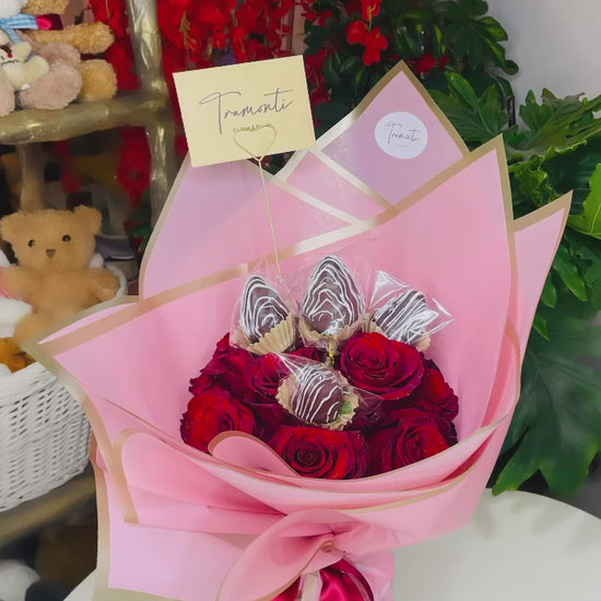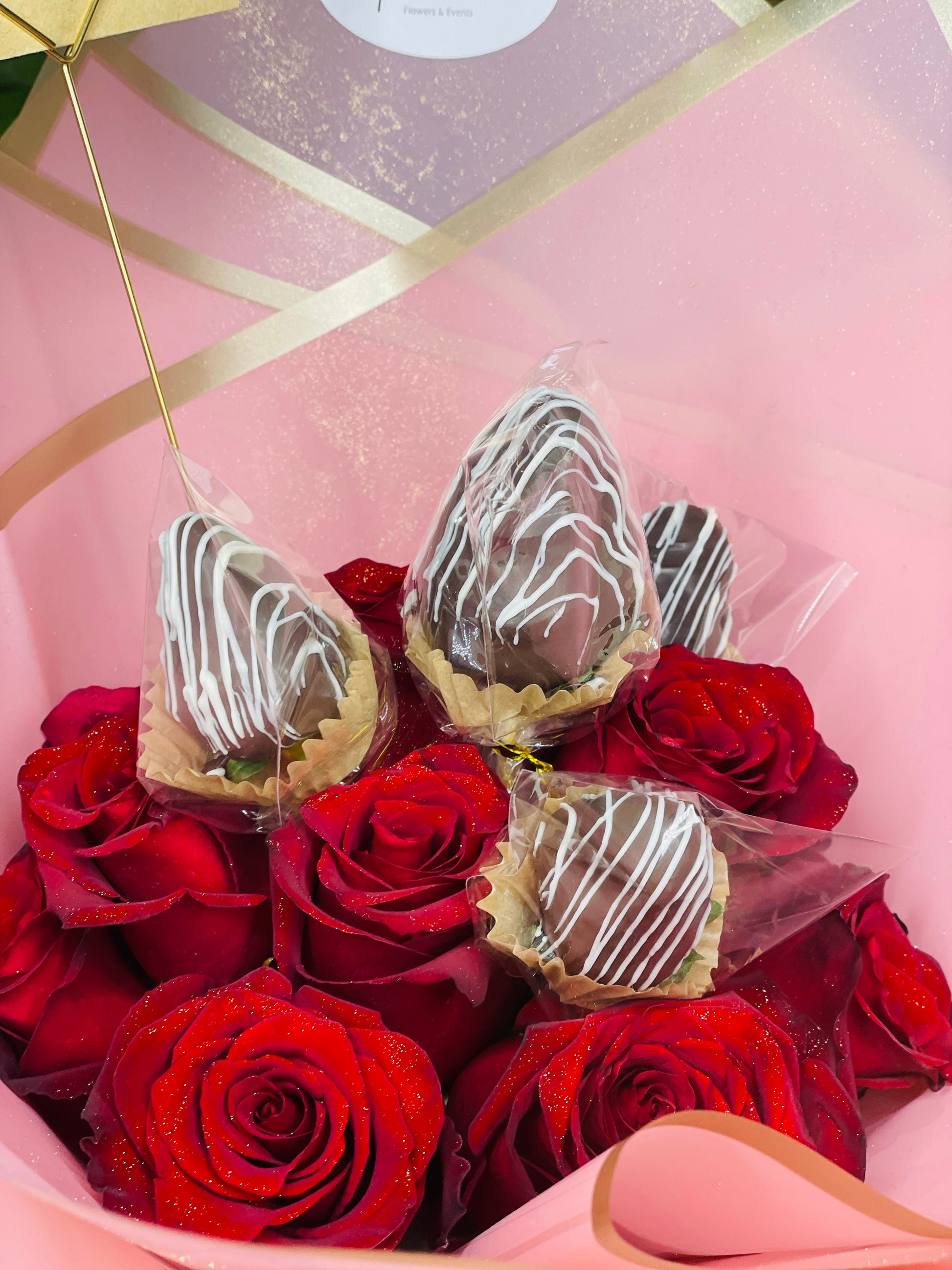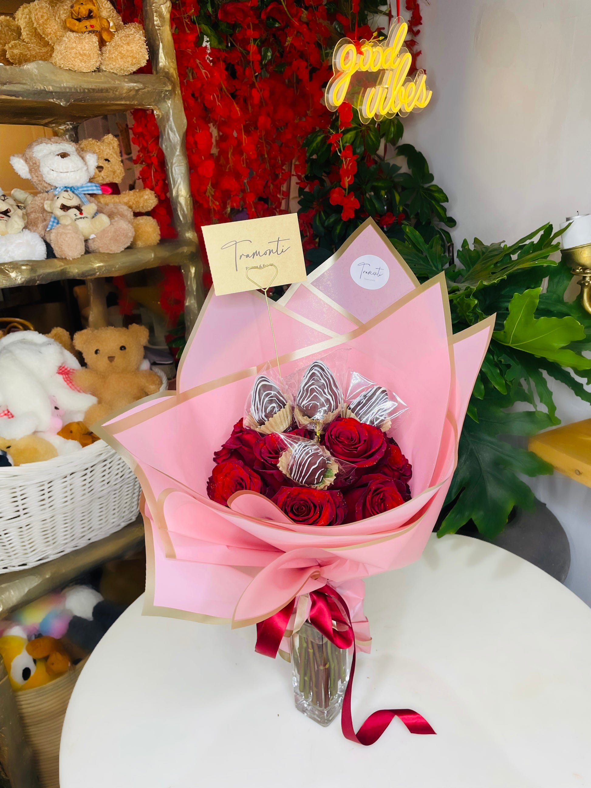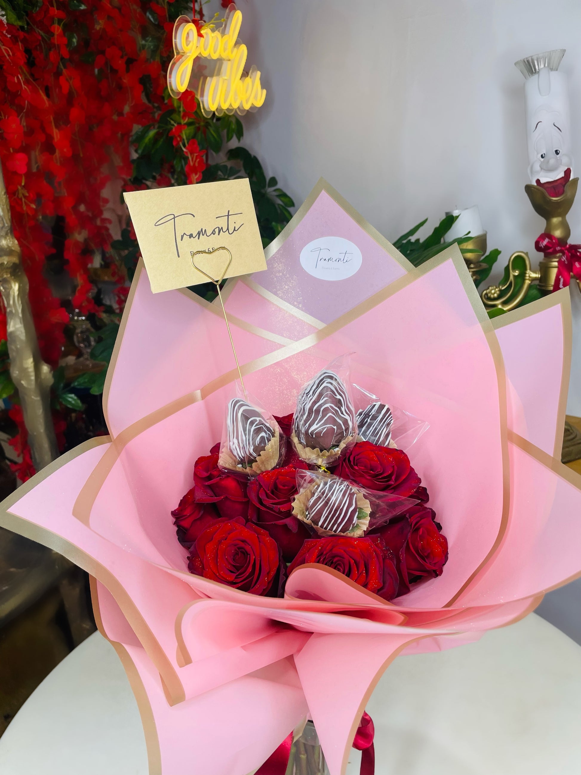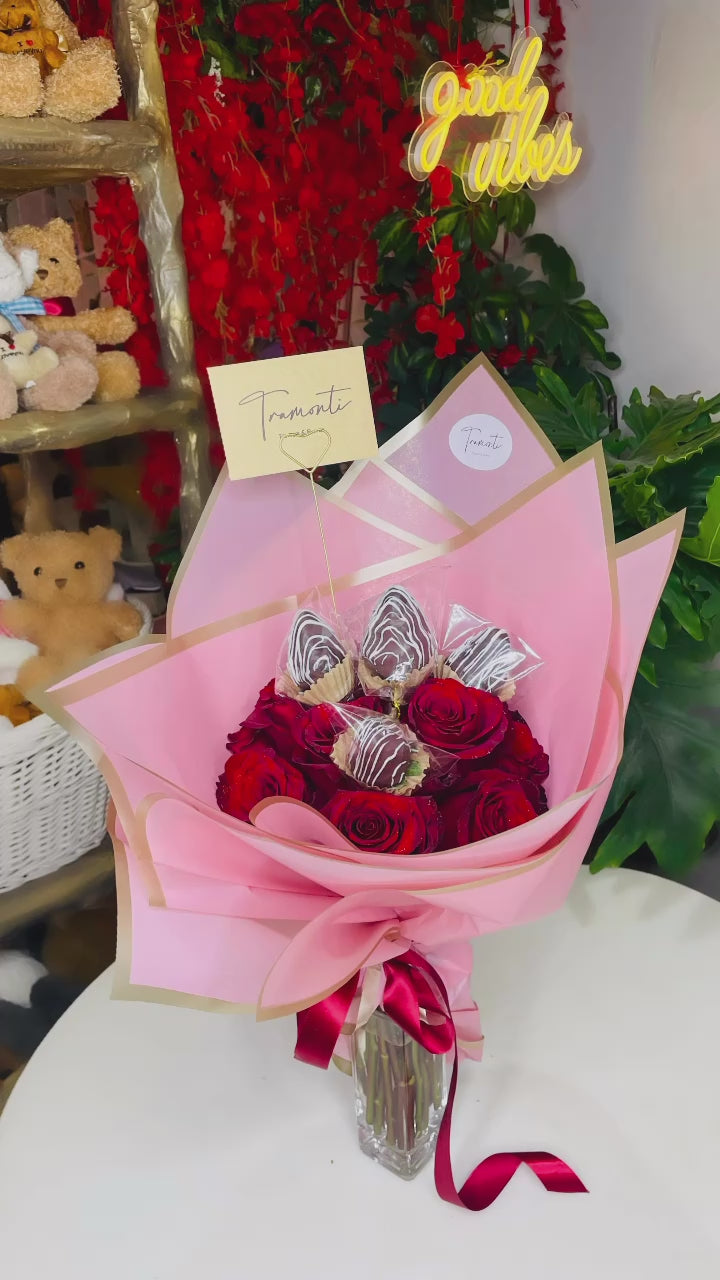 Introducing "Sweet Roses" – a luxurious gift that combines the elegance of 12 premium roses delicately wrapped in soft pink paper with the indulgence of chocolate-covered strawberries. This exquisite arrangement is perfect for expressing your affection, celebrating special moments, or simply treating yourself to a touch of luxury. With "Sweet Roses," you're not just giving flowers; you're gifting a memorable experience that delights the senses and warms the heart. Elevate any occasion with the timeless beauty and irresistible charm of "Sweet Roses."