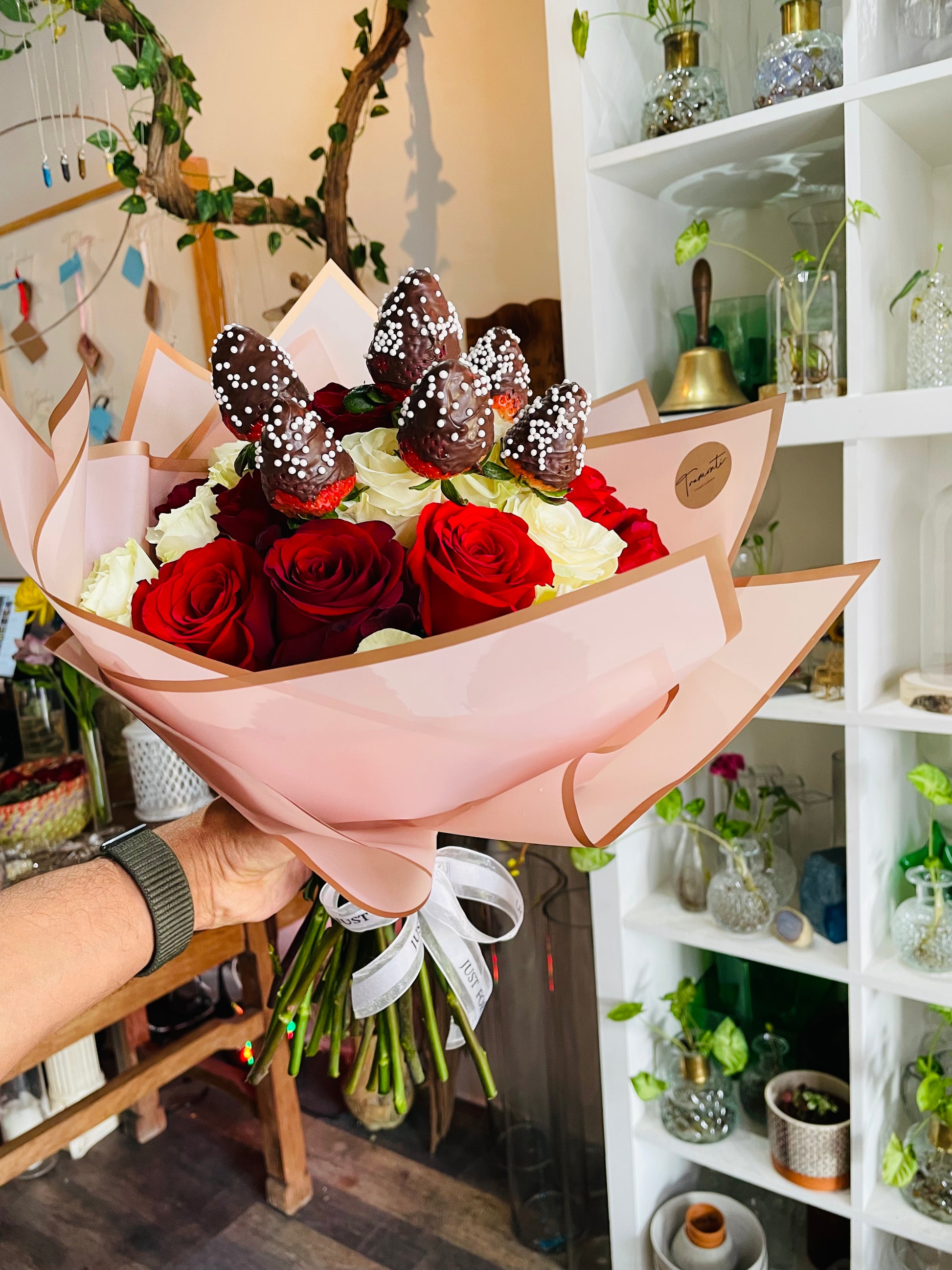 Presenting the "Sweet Bouquet," a delightful combination of two dozen premium mixed roses expressing a symphony of colors and emotions. Accompanying this floral beauty are six large chocolate-dipped strawberries, adding a touch of sweetness and indulgence. This sweet bouquet is a perfect blend of elegance and delectable treats, making it an ideal gift to convey love and appreciation.