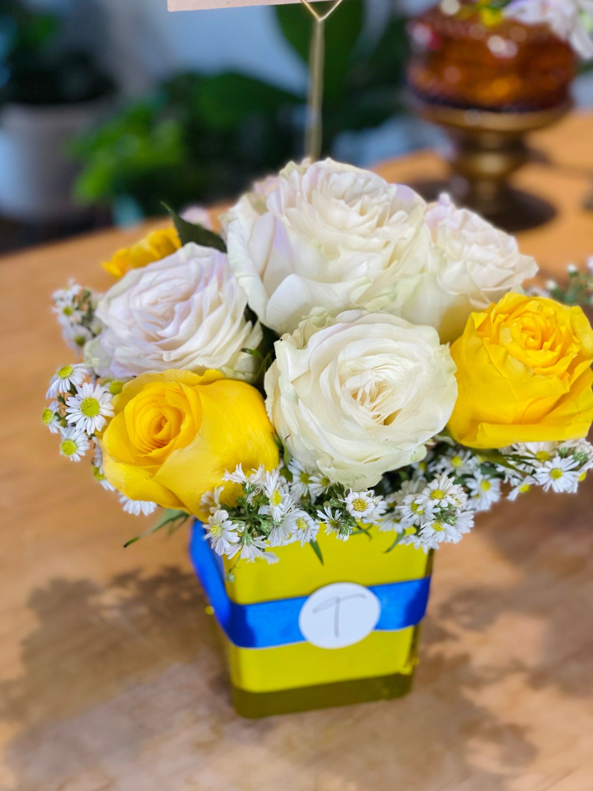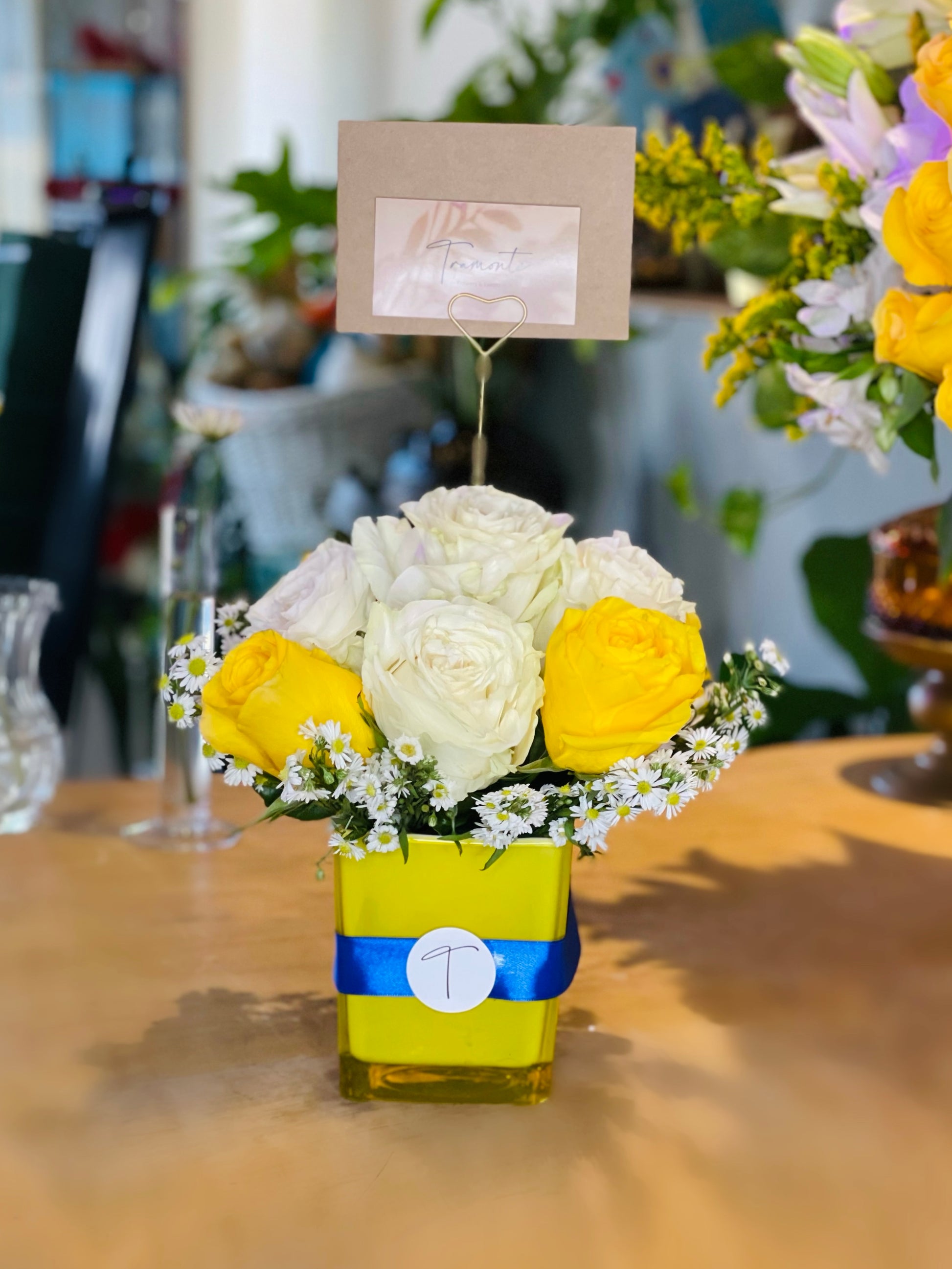 An arrangement featuring the elegance of special white and yellow roses, a beautiful tribute to cherish the memory of someone special
