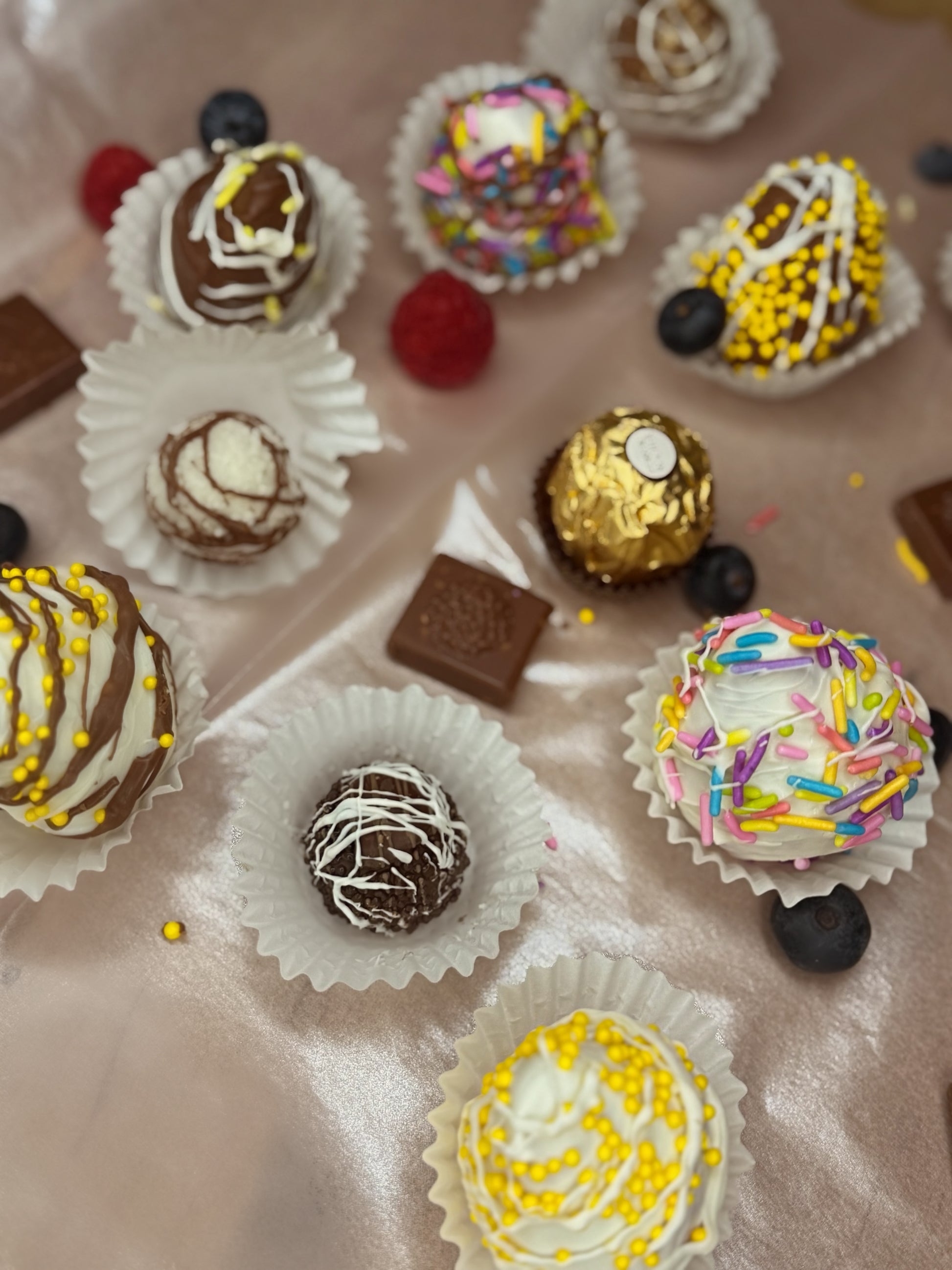 At the heart of the arrangement, luscious chocolate-covered strawberries glisten with a smooth and velvety coating, some adorned with elegant drizzles or decorative sprinkles for an extra touch of sophistication. Interwoven among them, the golden-wrapped Ferrero Rocher chocolates add a luxurious contrast, enhancing both the visual appeal and the indulgent experience.