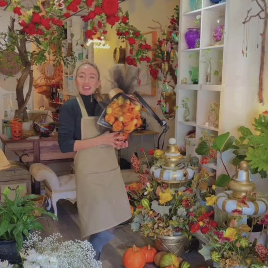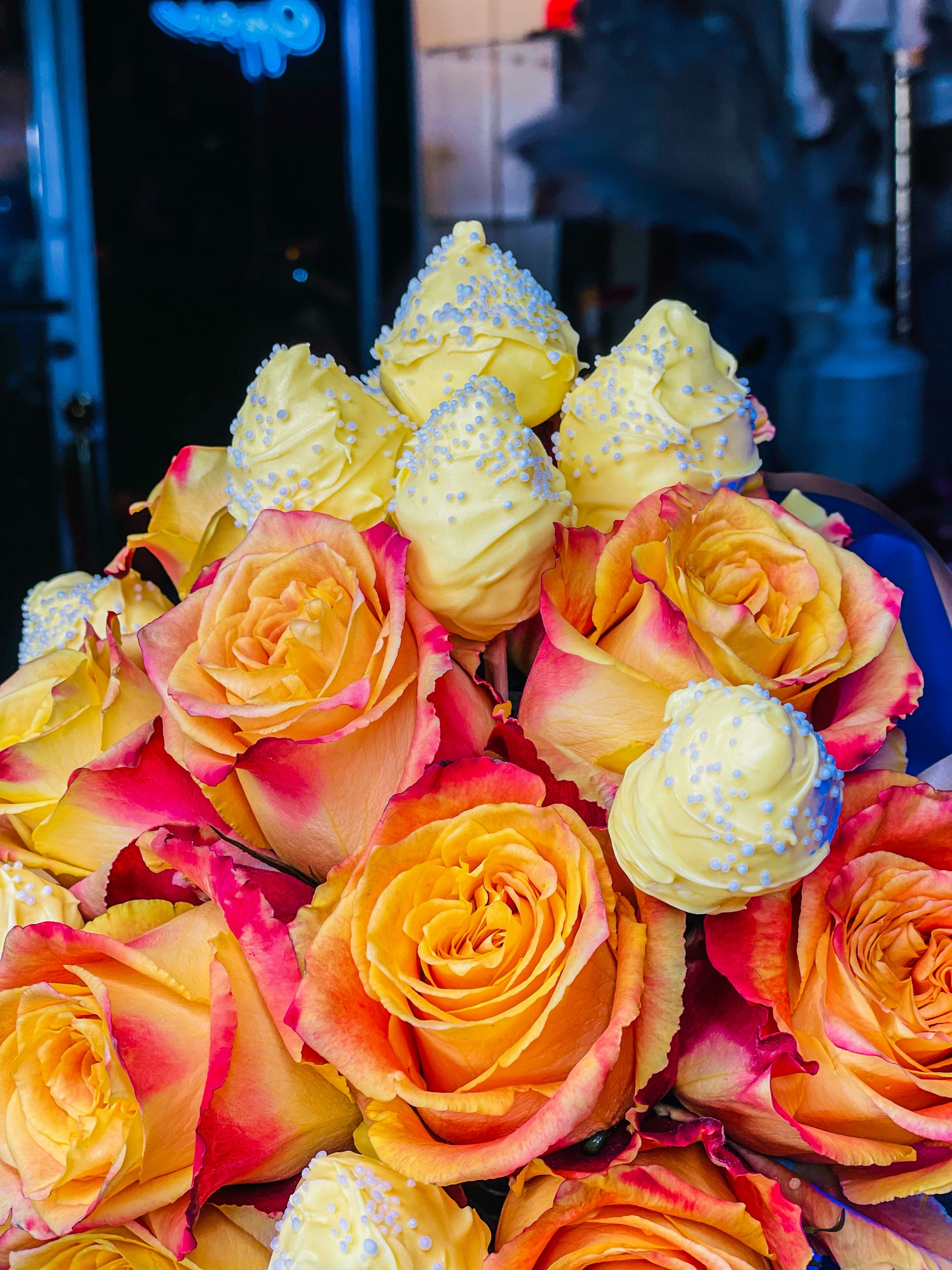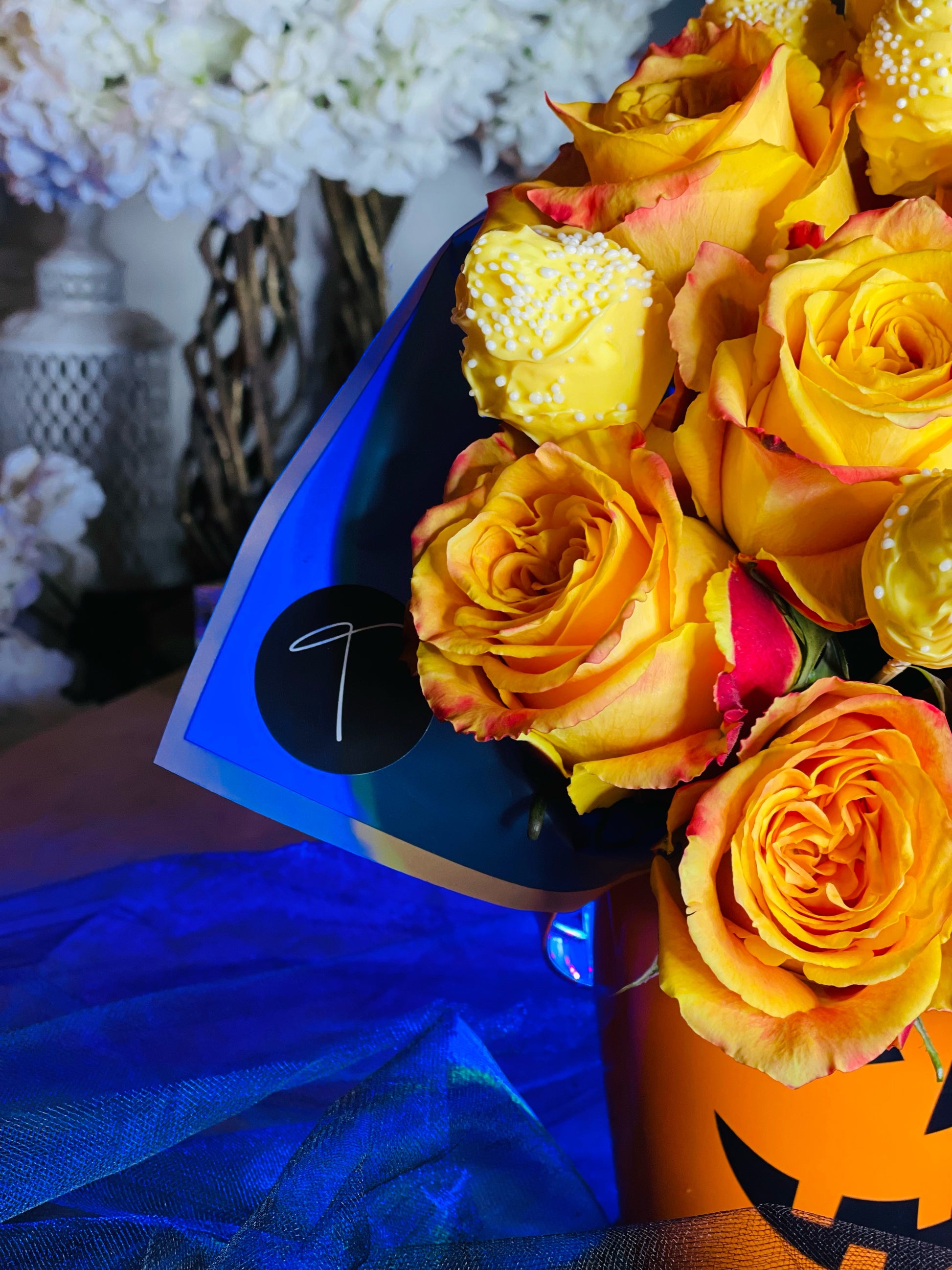Indulge in the spooktacular delights of our Halloween-themed floral arrangement, where elegant blooms entwine with the decadence of chocolate-covered strawberries. A hauntingly beautiful bouquet of orange roses. Nestled among these hauntingly beautiful blossoms are plump, ghoulishly delicious strawberries, draped in smooth, rich chocolate. This arrangement is a perfect blend of sweetness and spookiness, making it an enchanting centerpiece for your Halloween celebration or a delightful gift for someone special during this haunting season.