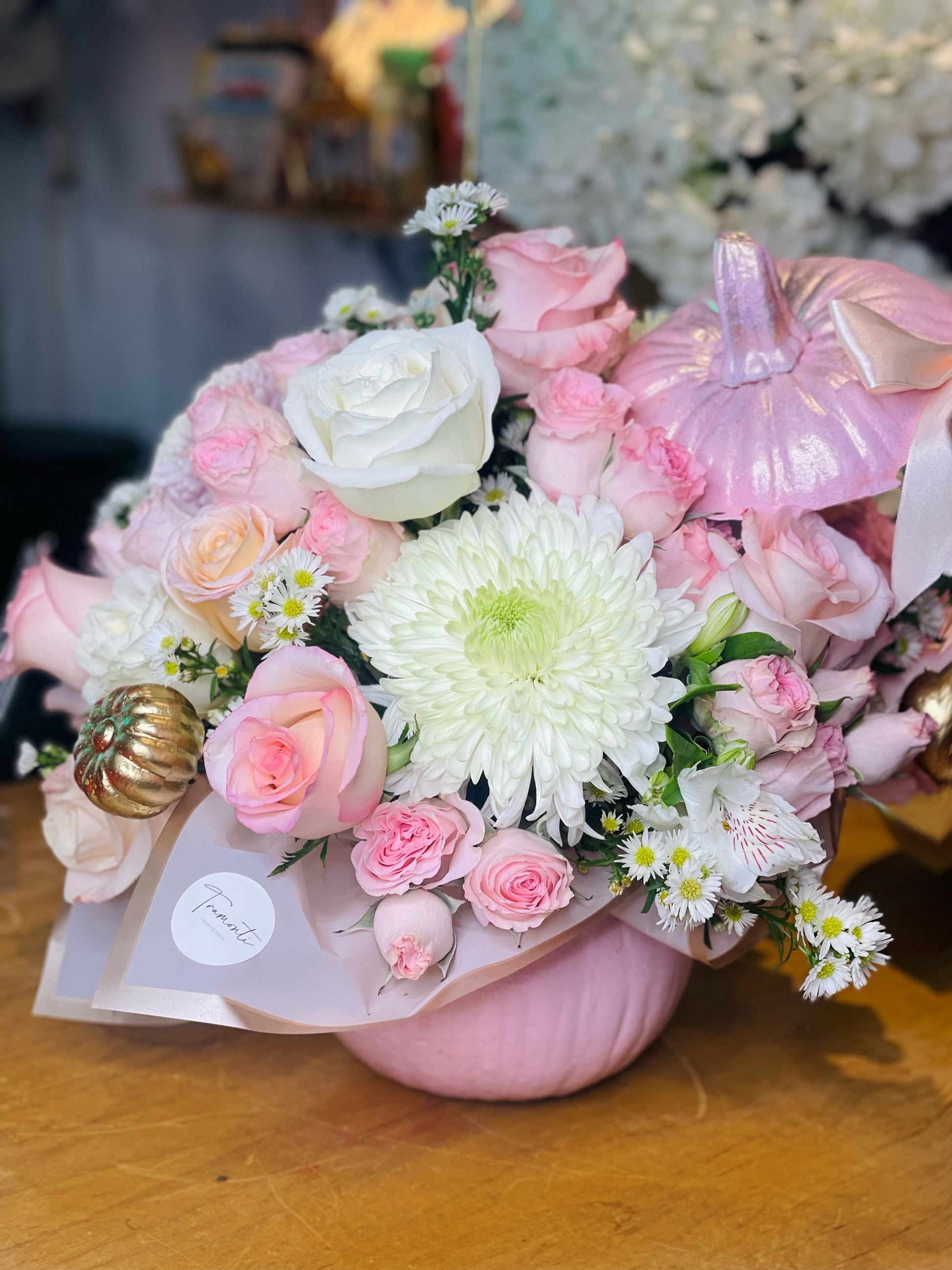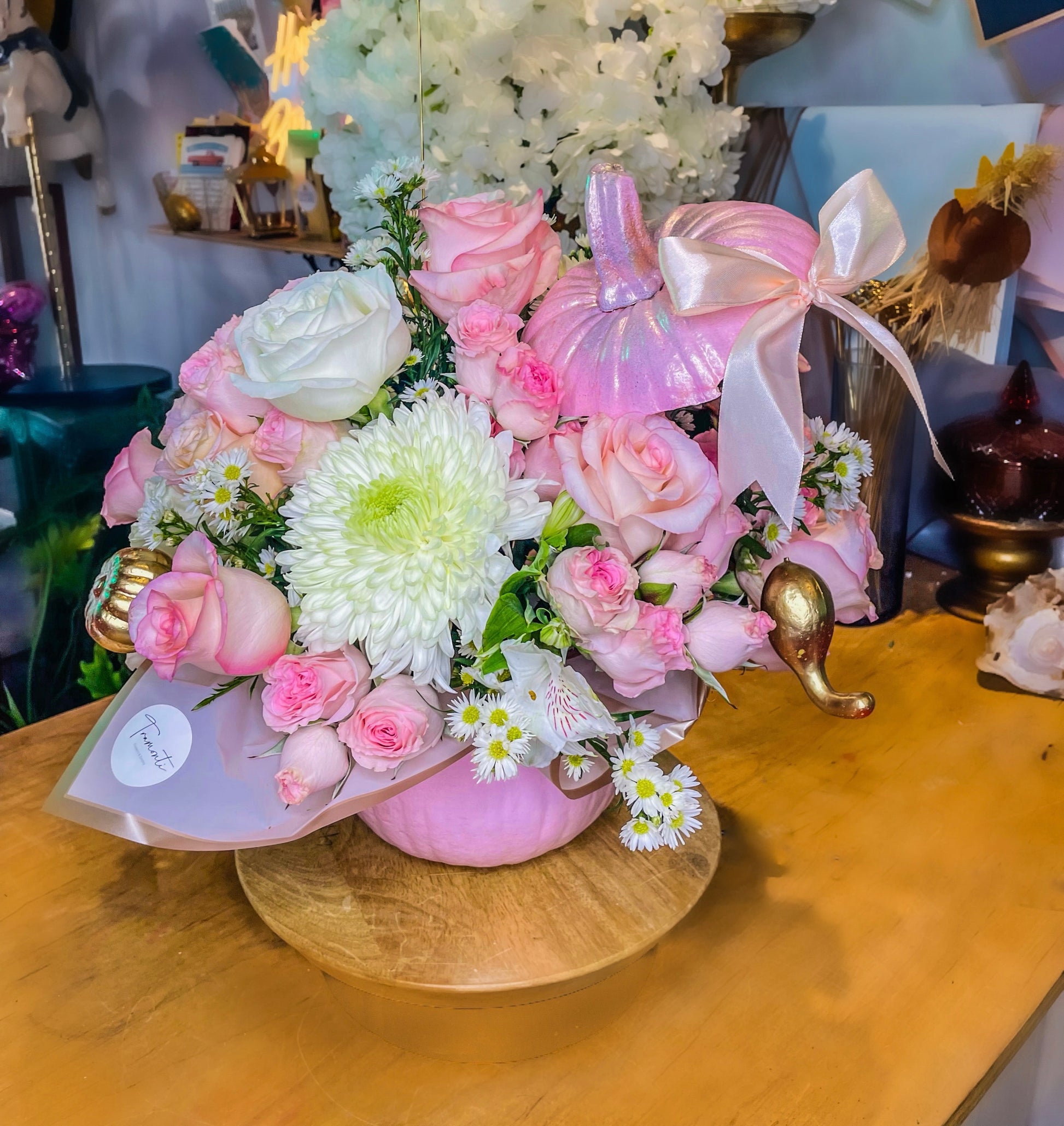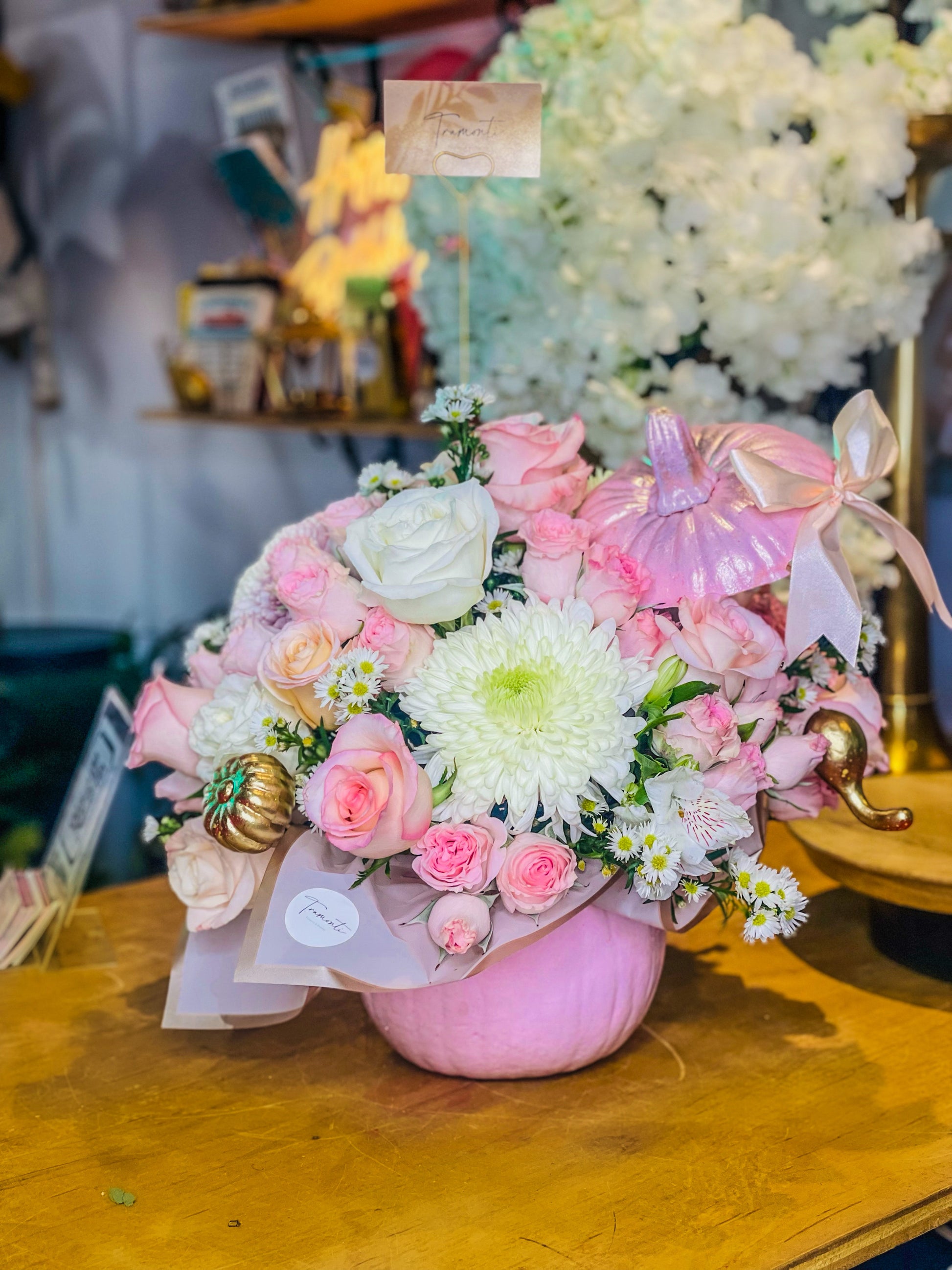 Prepare to be enchanted by the arrival of our spectacular, charming pumpkin, surrounded by exquisite roses in the most delicate shades of pink. As it stands among the wildflowers and glistens with golden zucchini, it's a true testament to nature's beauty and love.
