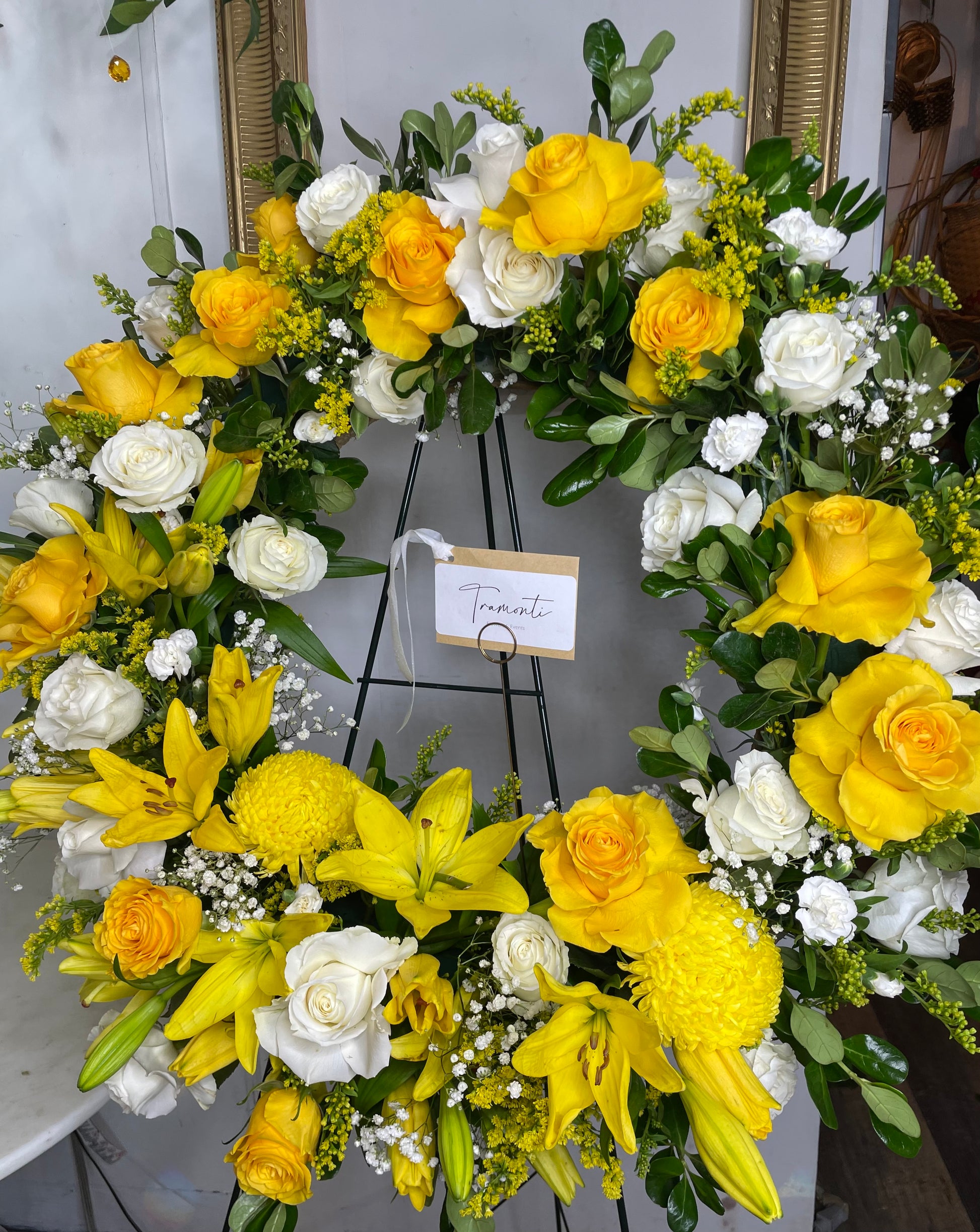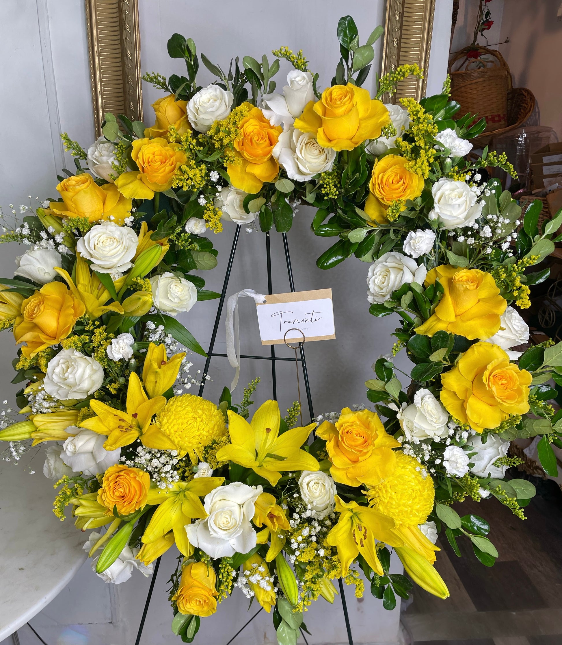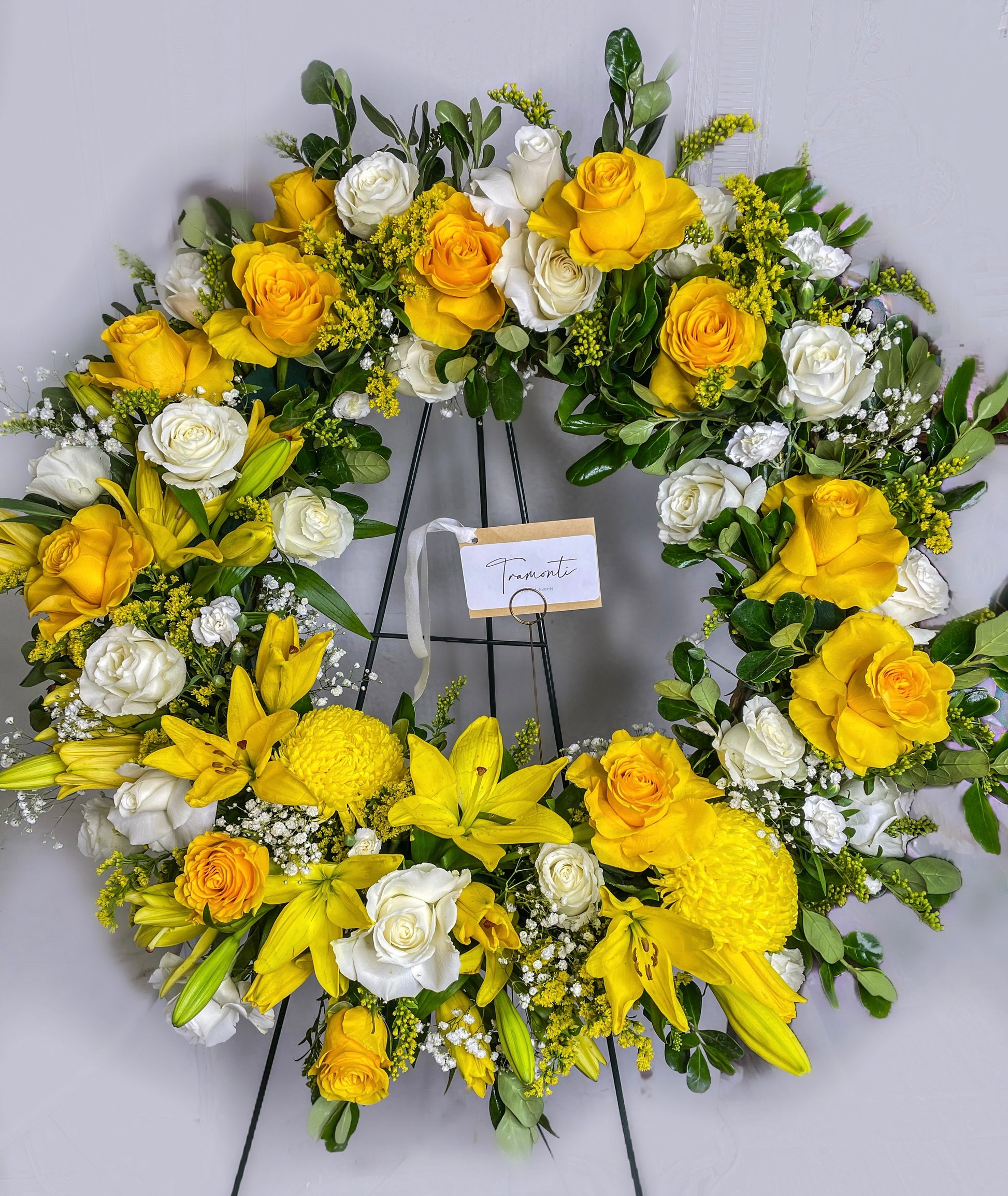 Refined Sympathy Wreath showcasing premium yellow and white roses, enhanced by beautiful yellow lilies, mini carnations, delicate baby’s breath, and lush greenery.