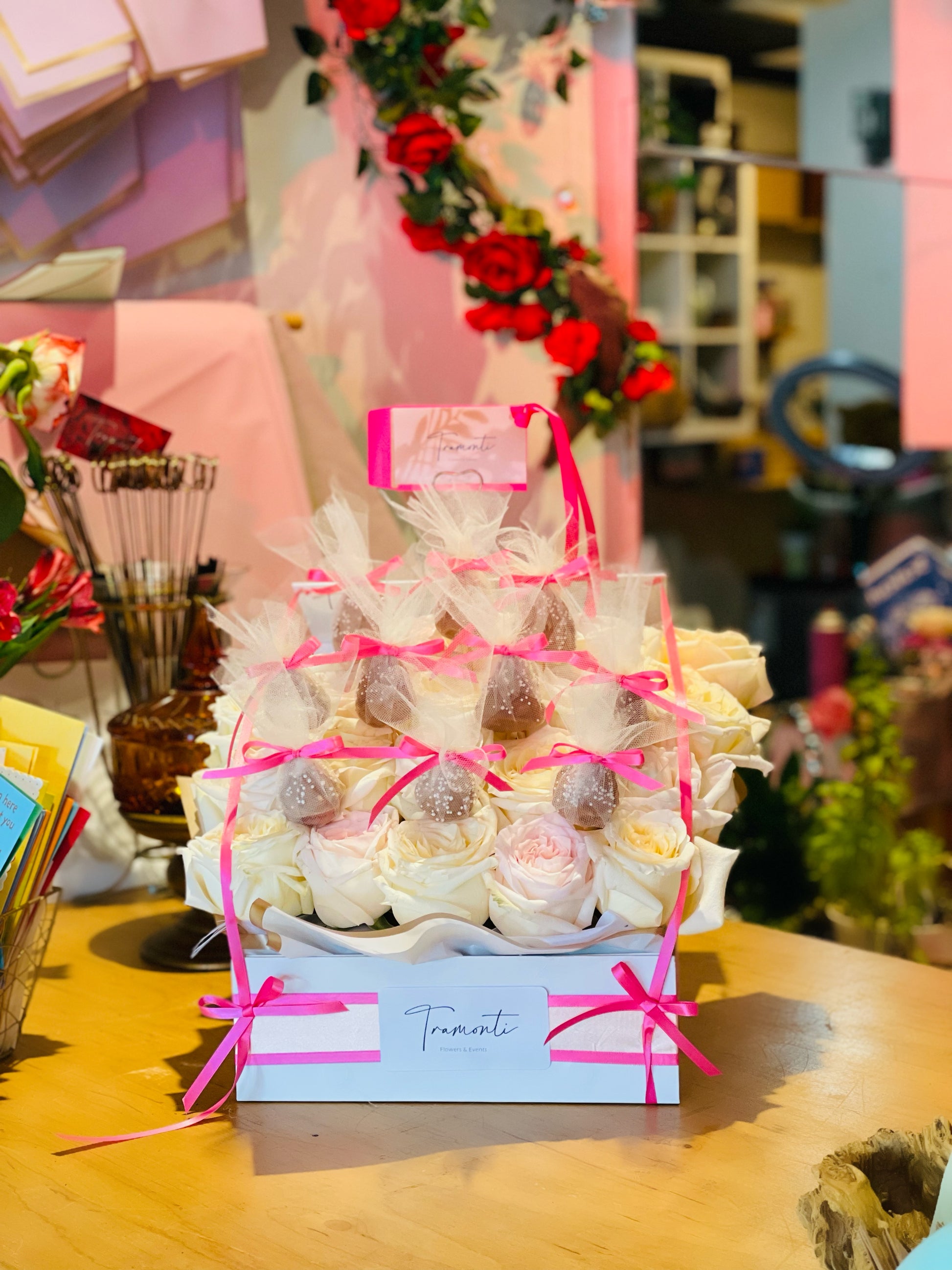 Introducing "Victoria's Elegance," a splendid arrangement designed for royalty. This thoughtfully crafted ensemble features roses in two exquisite shades, Cream de la Cream and White O'Hara, destined to bring a smile to her face. Accompanied by handpicked strawberries dipped in real chocolate, it's a delightful indulgence for her paladar, creating a truly regal and enchanting experience.