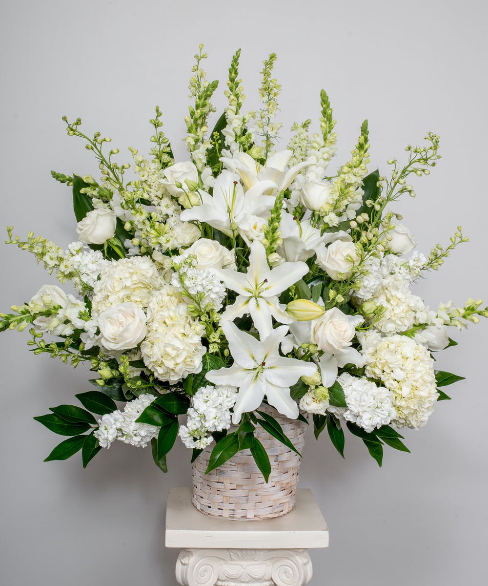 12 Premium playa Blanca Rosa, 12 white snapdragons, 5 white large lilies, 12 white delfinios, 5 hydrangea with greens in a white basket